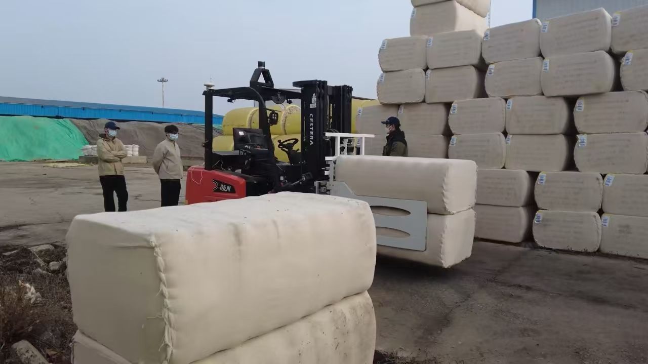 本站讯(文/王鹤立 刘晓艳 视频/王鹤立)又值新疆长绒棉采摘季,新疆生产建设兵团第八师121兵团德鑫农机服务专业合作社的棉花轧花厂中,堆起了一座座十几米高的棉花小山,正待打成棉包,搬运入库。这是一项浩大的工程。但就在这些“棉花山”中,一辆无人驾驶的小车灵活地穿梭其间,伸出“双臂”“抱”起一个个棉花包,轻松地搬运着,忙碌而有序。