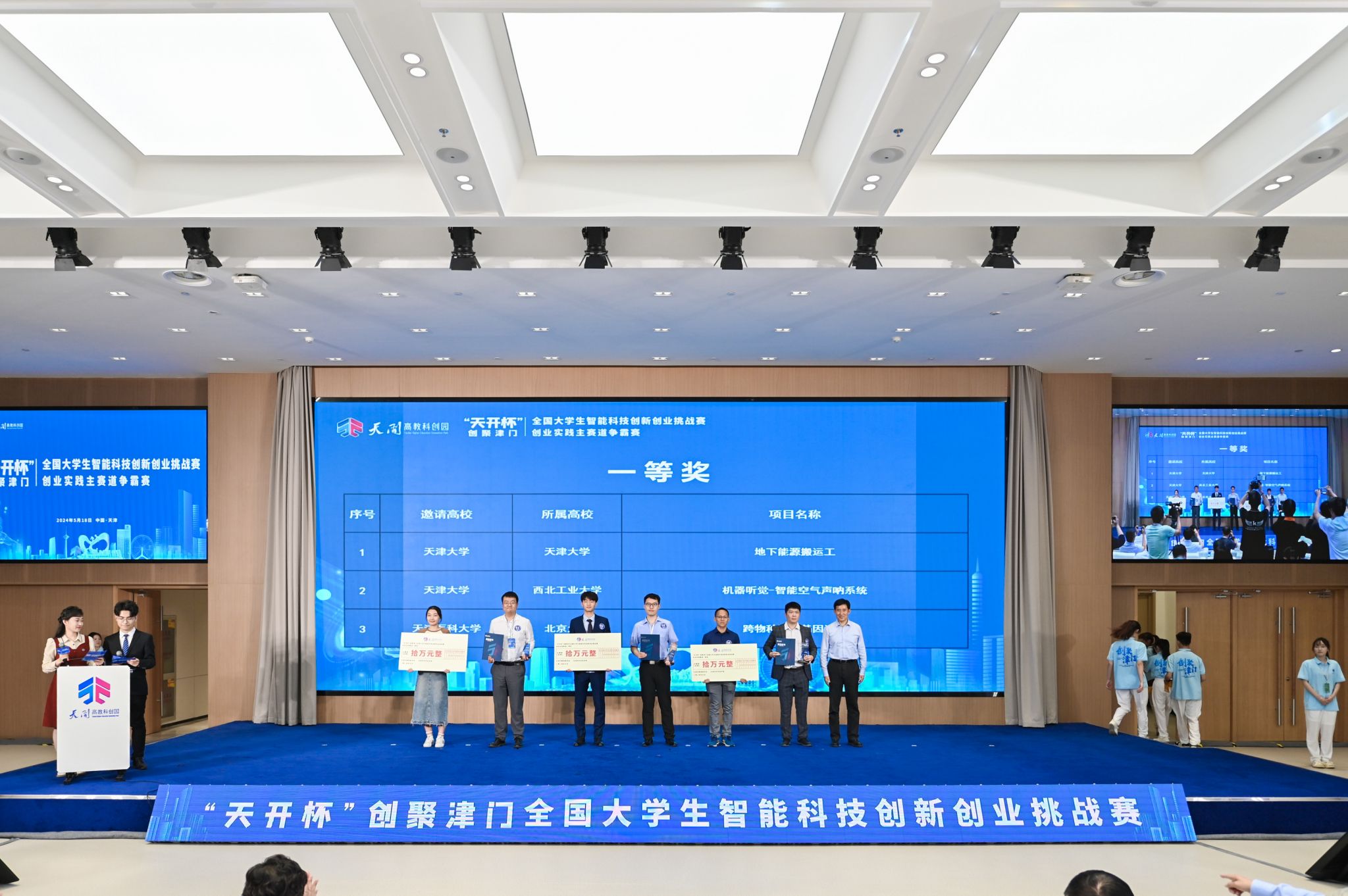 本站讯(天津大学教务处供稿)5月18日,“天开杯”创聚津门全国大学生智能科技创新创业挑战赛主赛道争霸赛成功举办。市委副书记、市委教育工委书记陈辐宽致辞并为获奖项目颁奖,副市长张玲、天津大学校长金东寒为“京津冀校友创业联盟”揭牌。经过激烈角逐,来自天津大学、西北工业大学、北京大学的三支项目团队获得大赛一等奖。争霸赛现场,有八个项目与天开园签署落地协议,“京津冀校友创业联盟”同时成立。
