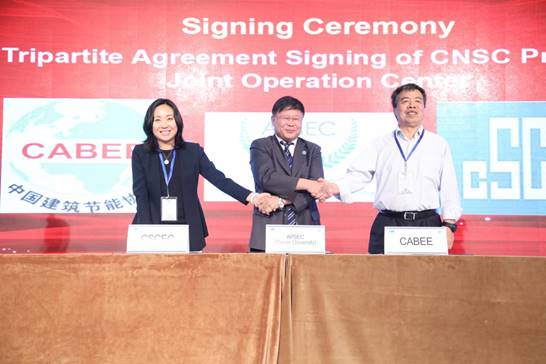论坛上中国建筑节能协会、中国建筑集团有限公司和APEC可持续能源中心共同签署了CNSC联合运营中心三方协议。