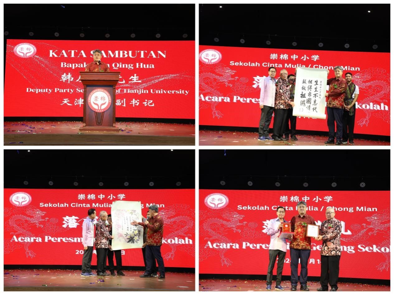 7月14日,崇棉中小学落成典礼在雅加达举行,韩庆华代表我校出席活动、致辞,并向崇棉中小学赠送由我校刘珺副教授创作的书画作品。中国驻印度尼西亚大使馆临时代办周侃、崇棉教育基金会理事长苏用发、崇棉教育基金会董事长陈鹤秋、天津摩天集团董事长苏建民、印尼华社和教育界人士、中印尼记者等逾千人出席落成典礼。多年来广大印尼华人华侨通过捐资办学为印尼华文教育的发展壮大作出了巨大贡献,崇棉中小学的成立,标志着今后雅加达地区将有更多优秀学子有机会接受到优质的华文中小学教育,期盼崇棉中小学培养更多学业基础扎实、综合素质优良、能够传承中华优秀文化和具有广阔国际视野的三语人才!天津大学也将发挥自身学科优势,通过开展本土华文教育师资培训等方式助力印尼华文教育发展。