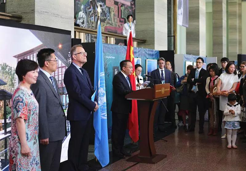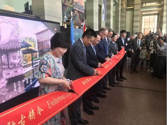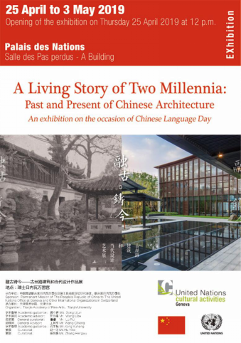 本站讯 2019年4月25日,由中国驻日内瓦代表团和联合国日内瓦办事处共同举办、天津美术学院和天津大学承办的联合国中文日活动“融古铸今--古丝路建筑和当代设计作品展”在日内瓦万国宫隆重举行。中国驻日内瓦代表团临时代办李松大使、中国驻世界贸易组织代表张向晨大使、联合国日内瓦办事处(联办)总干事穆勒,联办文化委员会主席皮萨诺,以及各国驻日内瓦使节、国际组织官员、国际职员、当地华人华侨、中文学校学生、各界友好人士约500人参加。我校建筑学院风景园林系副主任胡一可副教授与天津美术学院设计学部副主任、环境与建筑艺术学院副院长龚立君教授、鲁睿副教授、卢铁柱副教授作为展览承办方代表参加中文日活动。