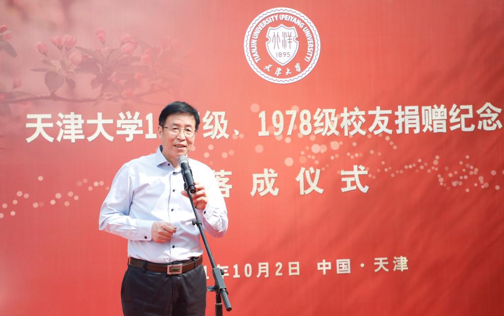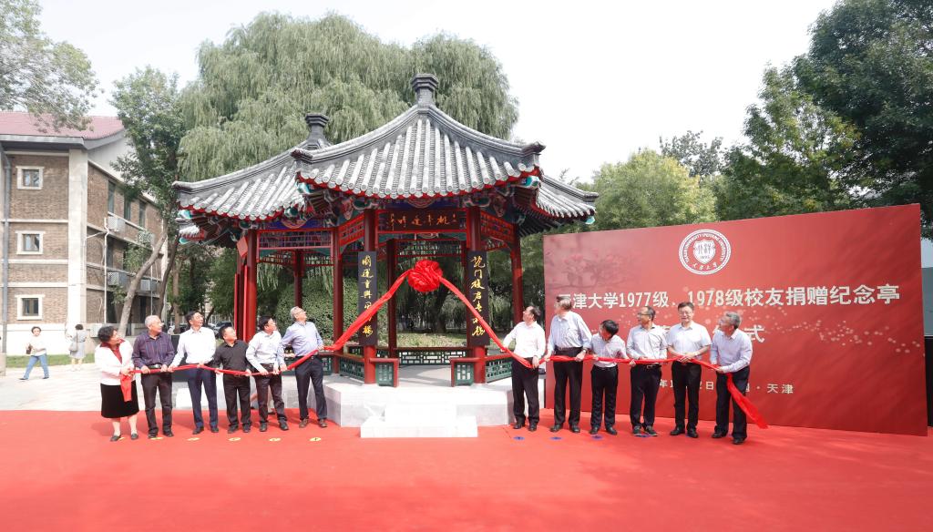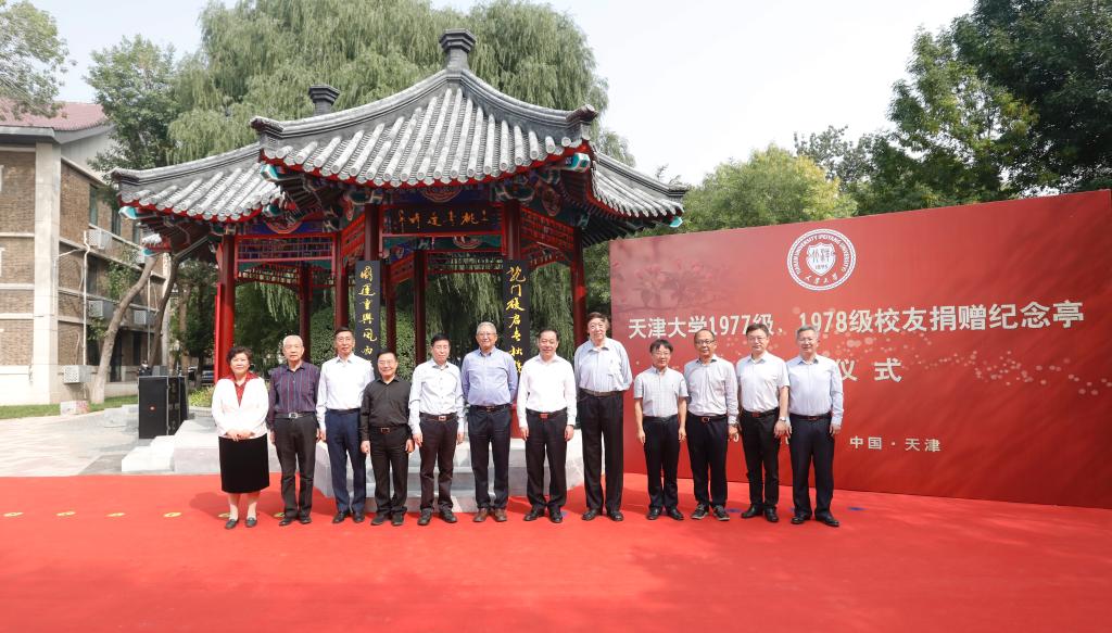 本站讯(通讯员 董玥欣 摄影 唐蒙)10月2日上午,在天津大学迎来建校126周年之际,由1977、1978级(以下简称77、78级)校友捐建的纪念亭在卫津路校区青年湖畔落成。天津大学党委书记杨贤金,天津大学原党委书记李家俊,天津大学冯骥才文学艺术研究院院长、著名作家、画家、文化学者冯骥才,天津市人大常委会原副主任张元龙校友,国家知识产权局副局长何志敏校友,天津市规划和自然资源局党委委员、一级巡视员路红校友,天津工业大学原党委书记张宏伟校友,天大天津校友会秘书长姚振国校友,天津大学副校长张凤宝等共同为纪念亭揭幕。