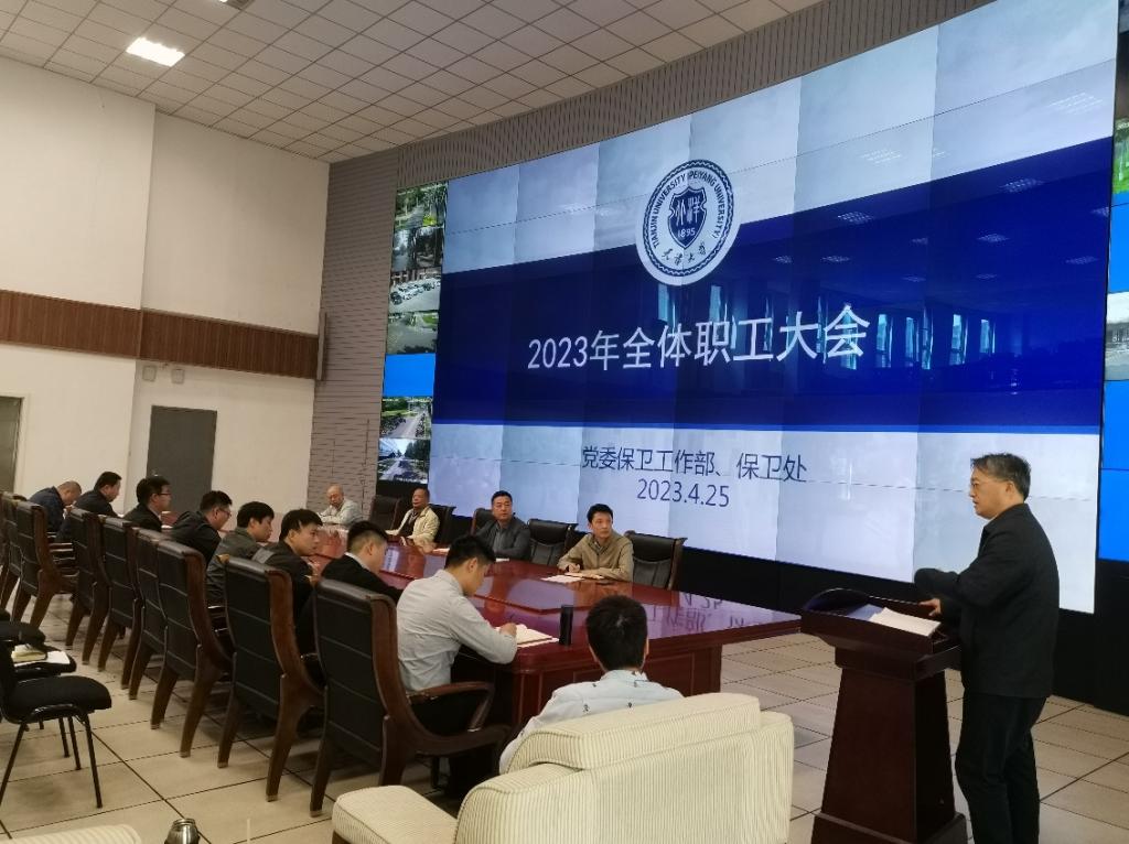 本站讯(通讯员 马占东)4月25日,天津大学党委保卫工作部2023年全体职工大会在北洋园校区安保中心二层监控大厅召开。校党委副书记韩庆华出席会议并讲话。
