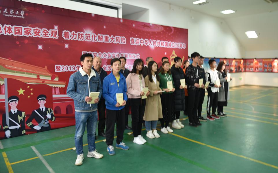 2019年4月12日14时,坚持总体国家安全观,着力防范化解重大风险,喜迎中华人民共和国成立70周年,天津大学国家安全义务宣传员聘用仪式暨2019年“4.15”全民国家安全教育活动启动仪式在卫津路校区体育馆二层天津大学国家安全教育基地顺利召开,参加会议的有天津大学党委常委校长助理张力新、天津大学保卫处处长袁惠龙、天津大学学工部副部长李劲松、天津大学团委副书记李霞、天津大学保卫处副处长徐钢,此外,天津市国安委、天津市国家安全局相关领导也莅临本次活动参观指导。