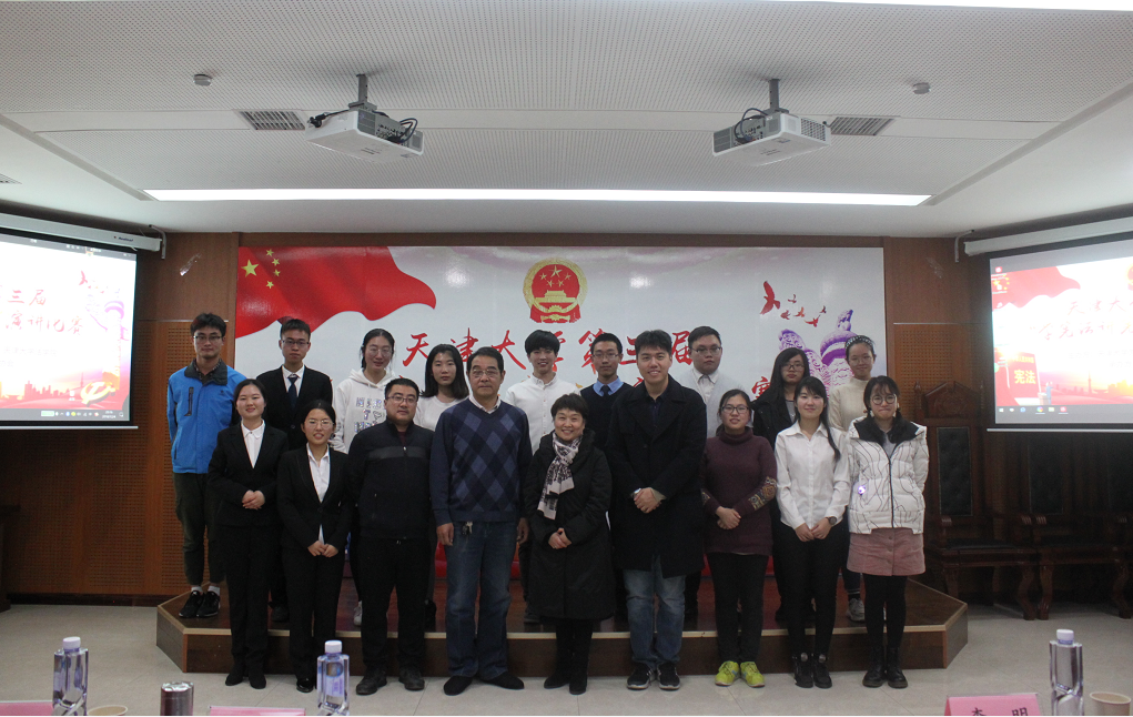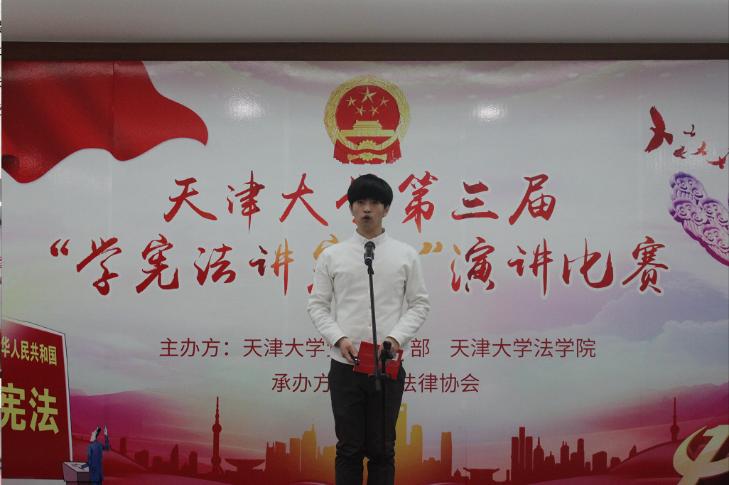 晚上6:30,由天津大学党委学工部、法学院共同举办,法学院北洋法律协会承办的天津大学第三届“学宪法讲宪法”主题演讲比赛于卫津路校区第7教学楼228模拟法庭举行。13位选手用自己独特的视角阐述了对宪法的理解、尊重和热爱,获得了在场师生的强烈共鸣。通过这次演讲比赛,同学们对宪法有了更理性的认识,立志要以“12·4国家宪法日”为起点,继续学习宪法、宣传宪法,努力做一个爱国爱党、遵纪守法、自强不息、全面发展的人。