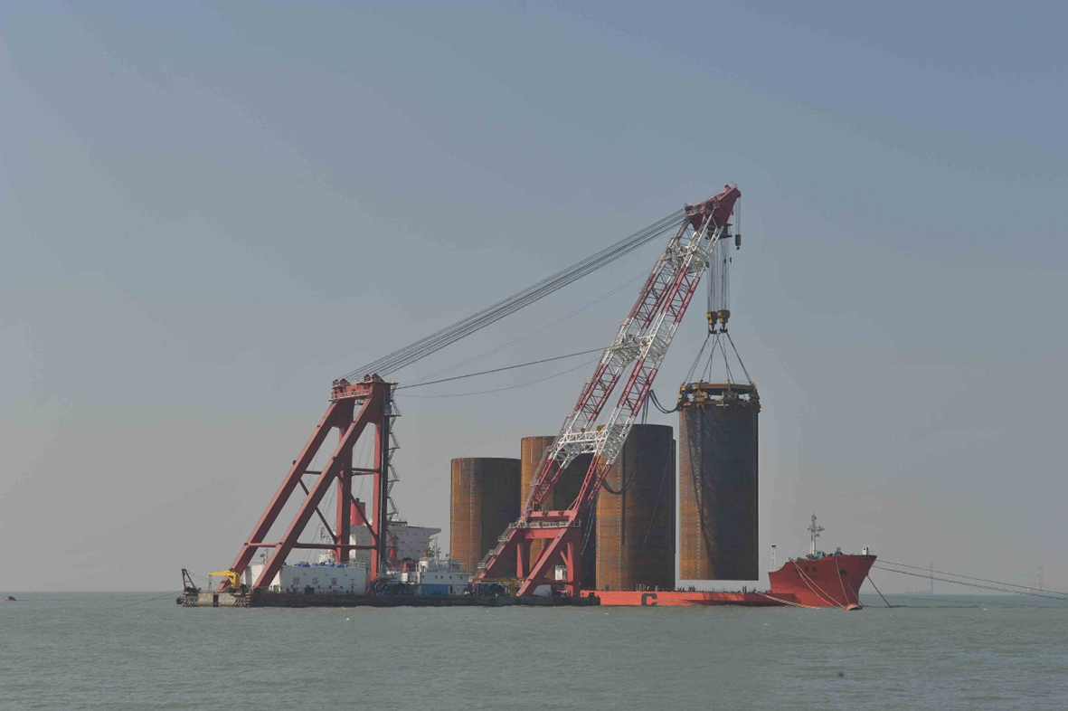 回忆起那段日子,卢永昌认为,最难的还是钢圆筒部分。毕竟,钢圆筒要插入地下四五十米,并且相对较软的土层,这个步骤都是世界性难题,全世界不存在相关规范。大钢圆筒单重500吨,高度50.5米,为世界最大。此外,采用8台液压锤联动下沉大直径圆筒为世界首创。利用圆筒的止水,实现岛内抽水,减低插板标高,通过降水达到350kPa超大荷载对深层软土进行预压,为国内乃至世界首次。“在外人看来几乎是不可能完成的任务,我们完成了!”卢永昌自豪地说。这一个个首次和首创,彰显的不仅仅是卢永昌及其团队的卓著成绩,更是不屈不挠的工匠精神。