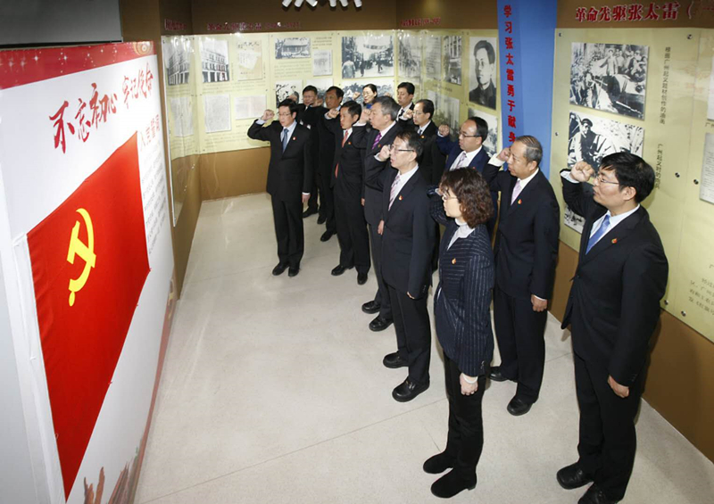 新一届常委在参观瞻仰完张太雷烈士纪念室后,集体肃立,面向党旗一起重温入党誓词。在校党委书记李家俊领誓下,全体常委同志举起右拳,庄严宣誓。