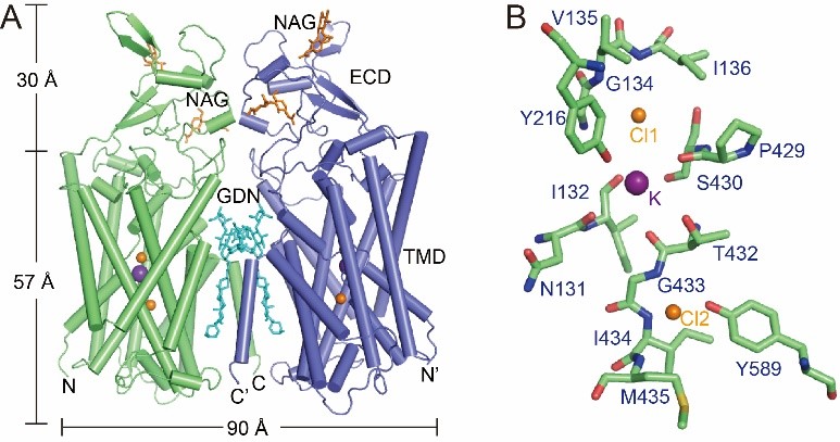 图1. 人源KCC1的结构。(A)KCC1的二聚体结构;(B)KCC1的钾离子与氯离子结合位点。