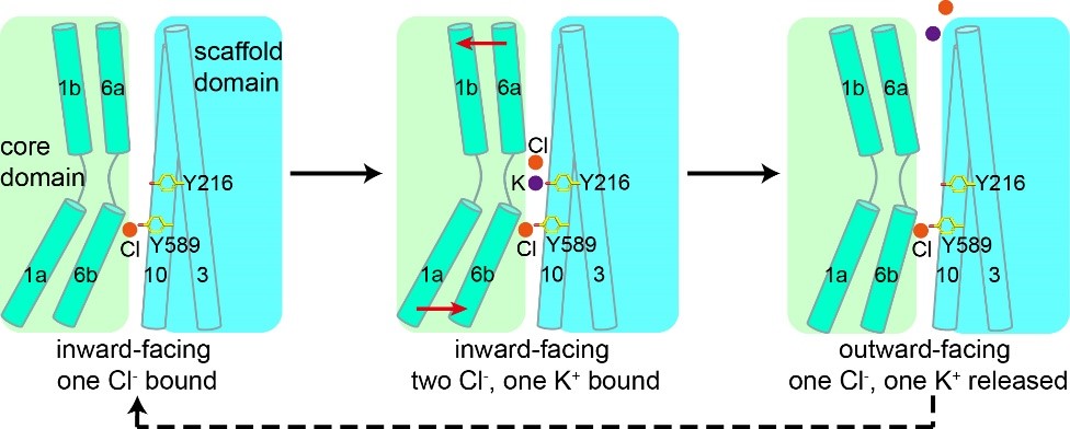 图2. KCC1共转运钾离子和氯离子的模型。第二个氯离子首先结合在第二位点,然后钾离子和第一个氯离子结合;