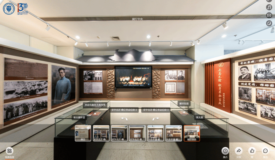 这座云端展厅运用三维建模、VR全景等数字技术,将天津大学多年积累的张太雷研究史料和实体展厅展览成果转化为可交互的沉浸式体验。记者看到,展厅内“北洋大学求学”“参与建党建团”“广州起义指挥部”等几大历史场景通过动态沙盘重现,烈士手稿、历史照片等数字化展品首次实现云端聚合。