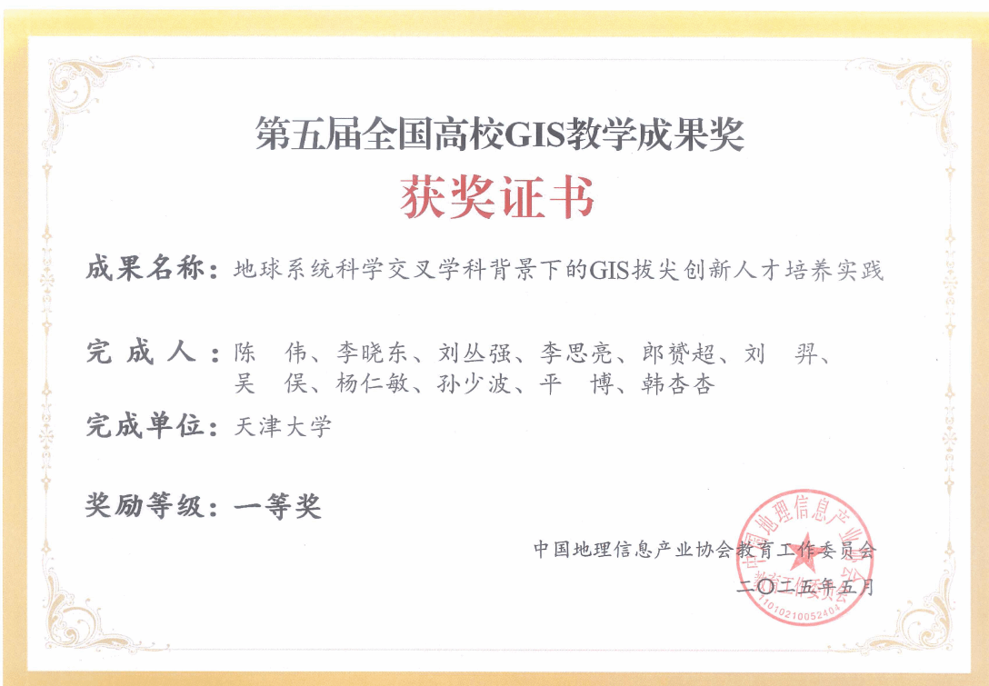 本站讯(文/赵礼娜)日前,中国地理信息产业协会组织开展了第五届全国高校GIS教学成果奖评选工作。天津大学地球系统科学学院申报的“地球系统科学交叉学科背景下的GIS拔尖创新人才培养实践”成果荣获全国一等奖,成果主要完成人为陈伟、李晓东、刘丛强、李思亮、郎赟超、刘羿、吴俣、杨仁敏、孙少波、平博、韩杏杏。
