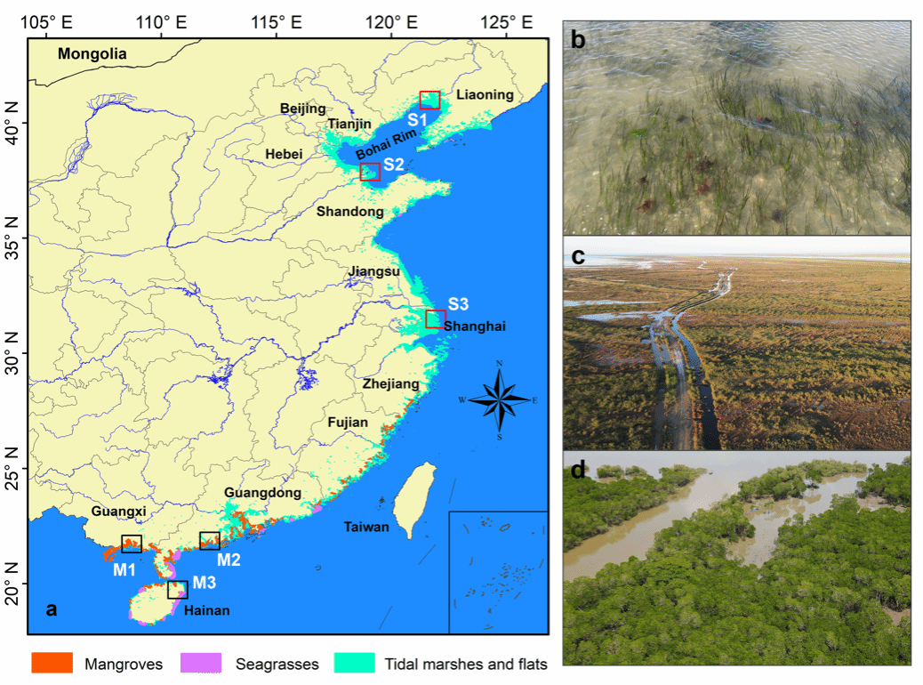 红树林、潮滩潮滩、海草床在内的滨海湿地蓝碳生态系统是全球碳吸收速率与储存能力最高的生态系统之一,被认为是一种重要的基于自然的气候解决方案。然而,由于目前对于滨海湿地蓝碳碳储量认识存在很大不确定性,在碳核算中滨海湿地蓝碳生态系统并未充分考虑。