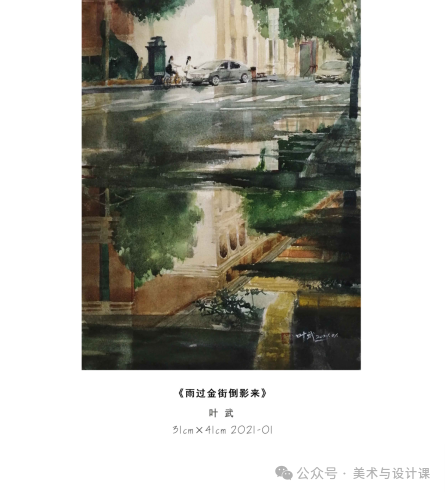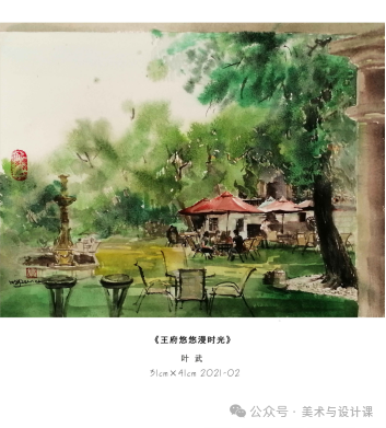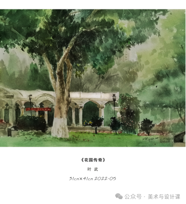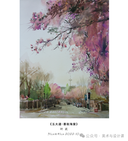 叶武老师水彩笔下的五大道各纵横交错的街巷,积淀着多彩历史风情,行人、车辆在花影中穿行,留下一道道流动的光影,那是岁月沉淀下的优雅,是自然与人文交融的美好。