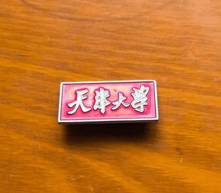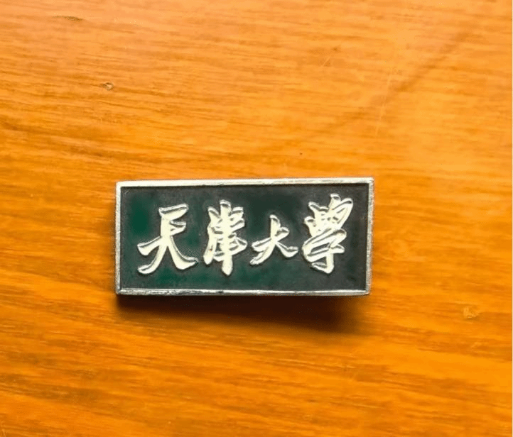 笔者收藏的天大本科学生校徽(白底)、81科英苏建华同学收藏的研究生校徽(绿底)、教工校徽(红底)