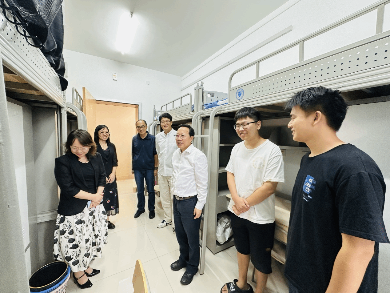 2025年9月17日,校长柴立元来到卫津路校区26斋,看望研究生新生,检查指导迎新准备工作。党办校办、学工部、后勤基建部等部门负责同志陪同检查。