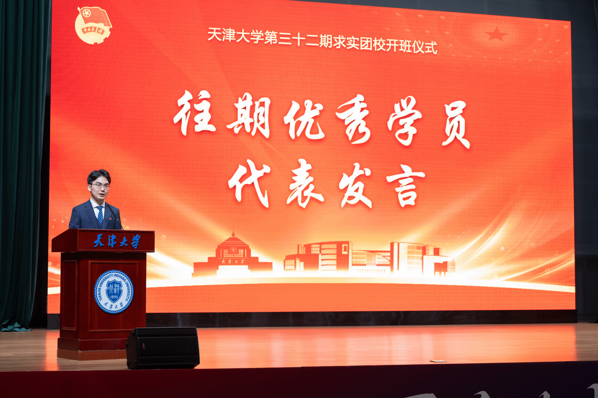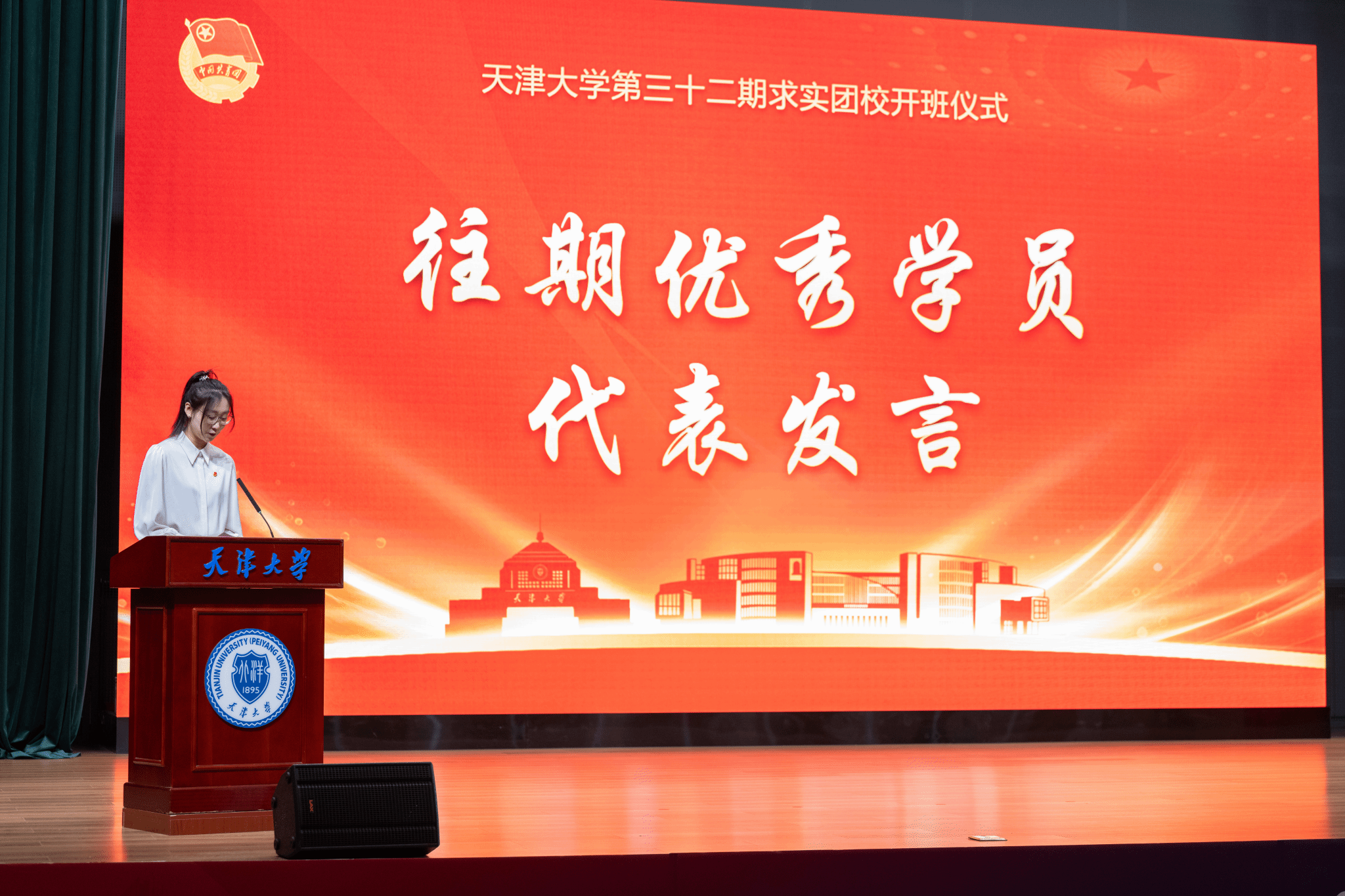 药学院2025级博士研究生、天津大学第十七期太雷班优秀学员代表罗畅回顾了自己从初入天大的迷茫到坚定信念、勇于尝试的成长历程,通过投身学生工作、参与太雷班实践、赴甘肃宕昌支教等经历,生动诠释了将个人理想融入国家需要的青年担当。他号召全体同学在理论学习和实践服务中锤炼本领,将学业、科研与学生工作有机结合,为服务“健康中国”等国家战略贡献青春力量。马克思主义学院2022级本科生、天津市第八期青马工程高校班学员代表李思潼则分享了自己从初团启航、在领航班淬炼、成长为天津市青马工程学员的成长之路,讲述了从理论积淀到实践转化的心路历程。她以亲身经历诠释“求实”真谛——知行合一、服务社会,并鼓励新学员在天大深厚的土壤中高擎使命,在民族复兴伟业中展现青年担当。