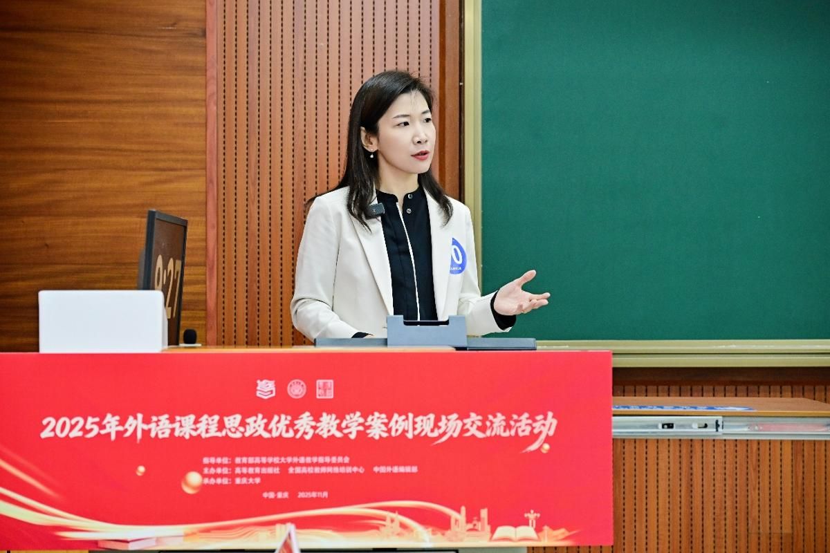本次交流活动由教育部高等学校大学外语教学指导委员会指导,高等教育出版社有限公司主办,重庆大学承办,旨在持续提升高校外语教师的思政教学能力,推动外语课程思政数字化案例库与示范项目的培育,进一步推进外语课程思政的高质量建设。交流活动现场,郝姗老师教学团队通过鲜活的教学案例和生动的教学方法,以饱满的热情、精湛的教学技艺和深刻的思政理解,将社会主义核心价值观与外语教学紧密结合,将思政理念与激发学生的学习兴趣及爱国情怀相融合,展现了外语课堂作为思政教育重要阵地的独特魅力。团队的教学设计不仅注重知识的传授,更注重培养学生的家国情怀和国际视野,真正实现了外语教学与思政教育的有机融合。