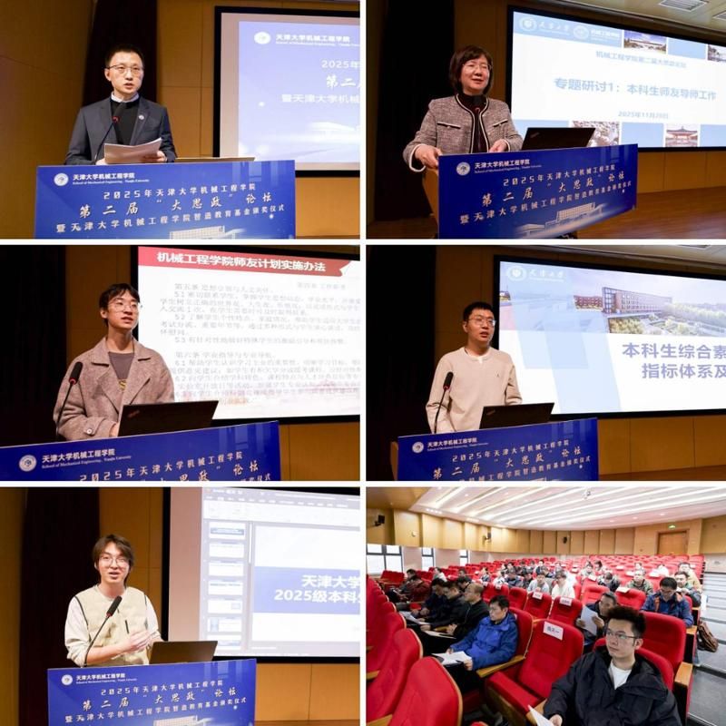 2025年11月28日下午,天津大学机械工程学院在北洋园校区37教学楼宏远报告厅举行第二届大思政论坛暨智造教育基金颁奖仪式。校党委书记杨贤金出席会议并讲话,首席辅导员冯翠玲,校关工委副主任、机械工程学院关工委主任孙月海,党委教工部副部长王颖,以及学院党委书记孙涛、院长柯燎亮、副院长刘正先、副院长邓帅、关工委秘书长谭耕耘出席活动,与机械工程学院师友导师代表、学生代表200余人齐聚一堂,共同见证学院思政育人工作的新成果与新气象。本次活动由学院党委副书记林杰威主持。