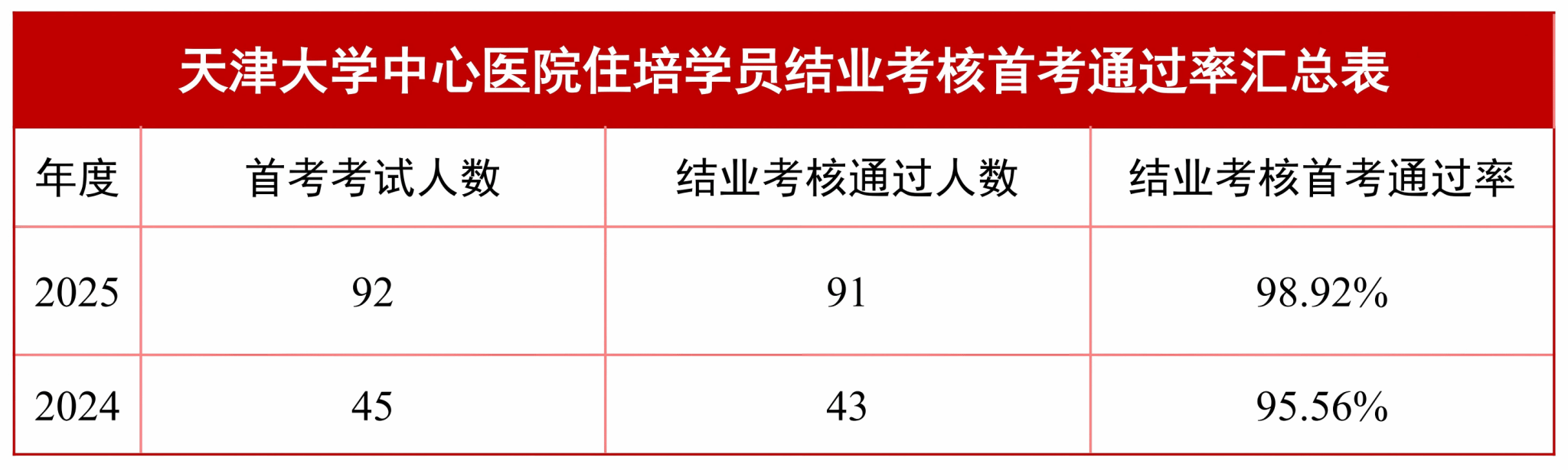 天津大学中心医院具有国家住院医师规范化培训基地10个、国家专科医师规范化培训基地2个,同时是天津市医师临床实践技能培训中心,承担着住院医师、专硕研究生和专科医师规范化培训任务。在校院各级领导的高度重视与大力支持下,各住培专业基地齐心协力、锐意进取,近两年结业考核成绩实现稳步提升,2024年首考通过率95.56%、2025年首考通过率98.92%。