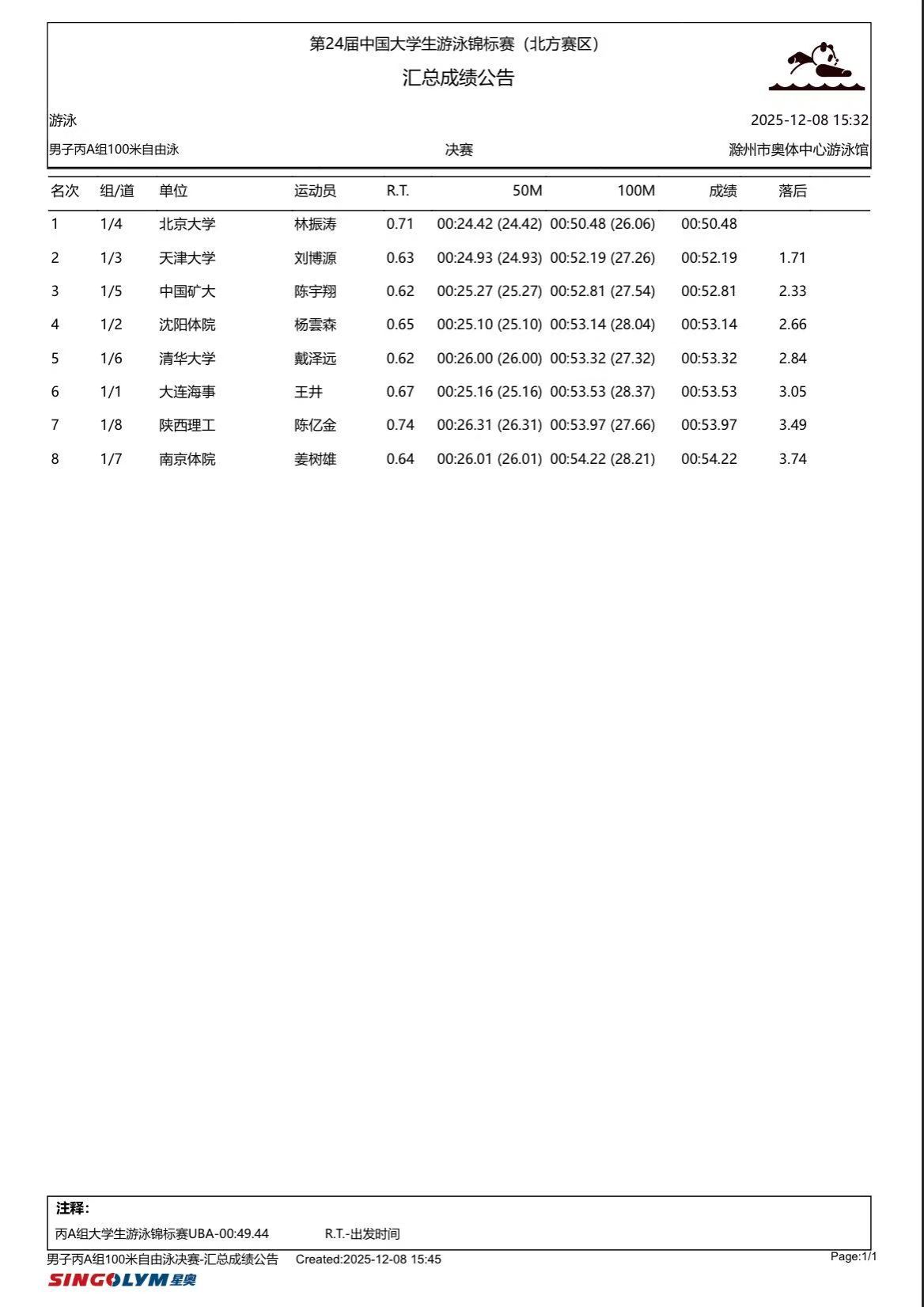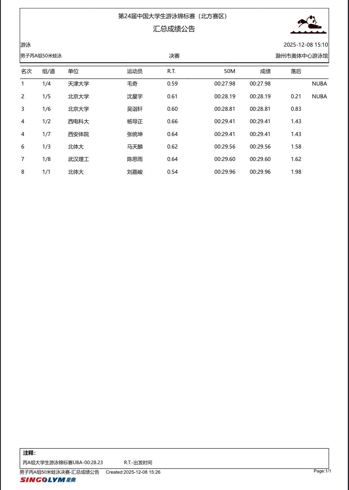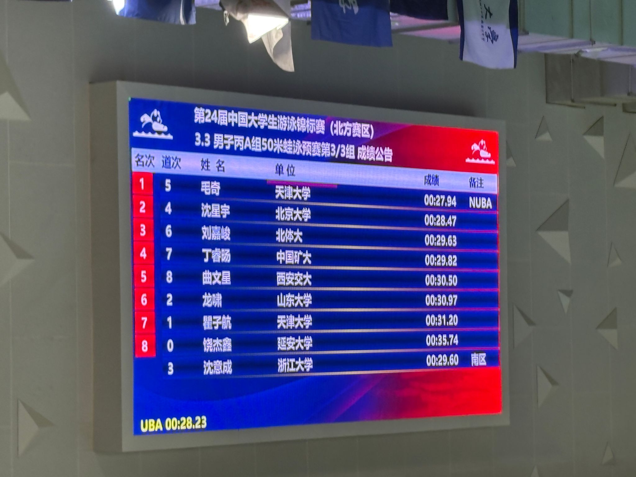 12月8日,在第24届中国大学生游泳锦标赛(北方赛区)的激烈较量中,天津大学捷报频传!我校高水平游泳队队员毛奇在男子50米蛙泳(高水平组)预赛中强势打破赛会纪录,并在决赛中一举夺魁;队员刘博源亦发挥出色,获得男子100米自由泳(高水平组)银牌!