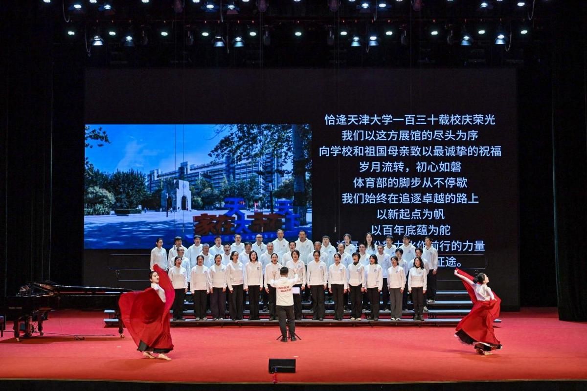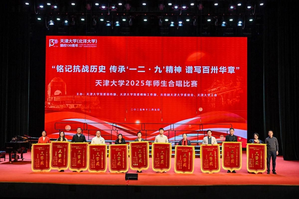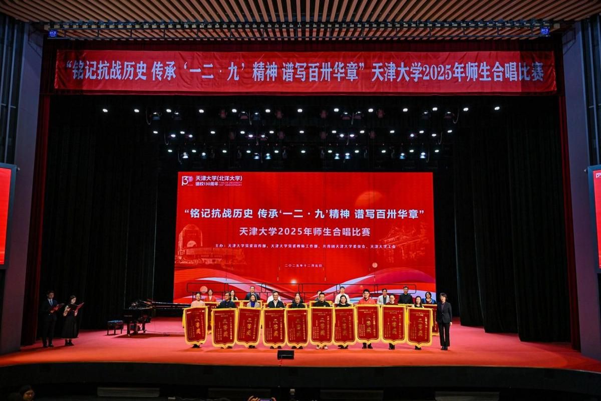 颁奖环节中,出席活动的校领导分别为获奖队伍颁发荣誉,向他们致以热烈祝贺,鼓励各单位以此次比赛为契机,持续传承红色基因、凝聚奋进力量。颁奖仪式后,全体人员起立合唱天津大学校歌,“不从纸上逞空谈,要实地把中华改造”的歌词与现场氛围深度交融,将活动推向高潮。歌声中,红色基因与百卅薪火交相辉映,爱国情怀与母校深情激荡人心。