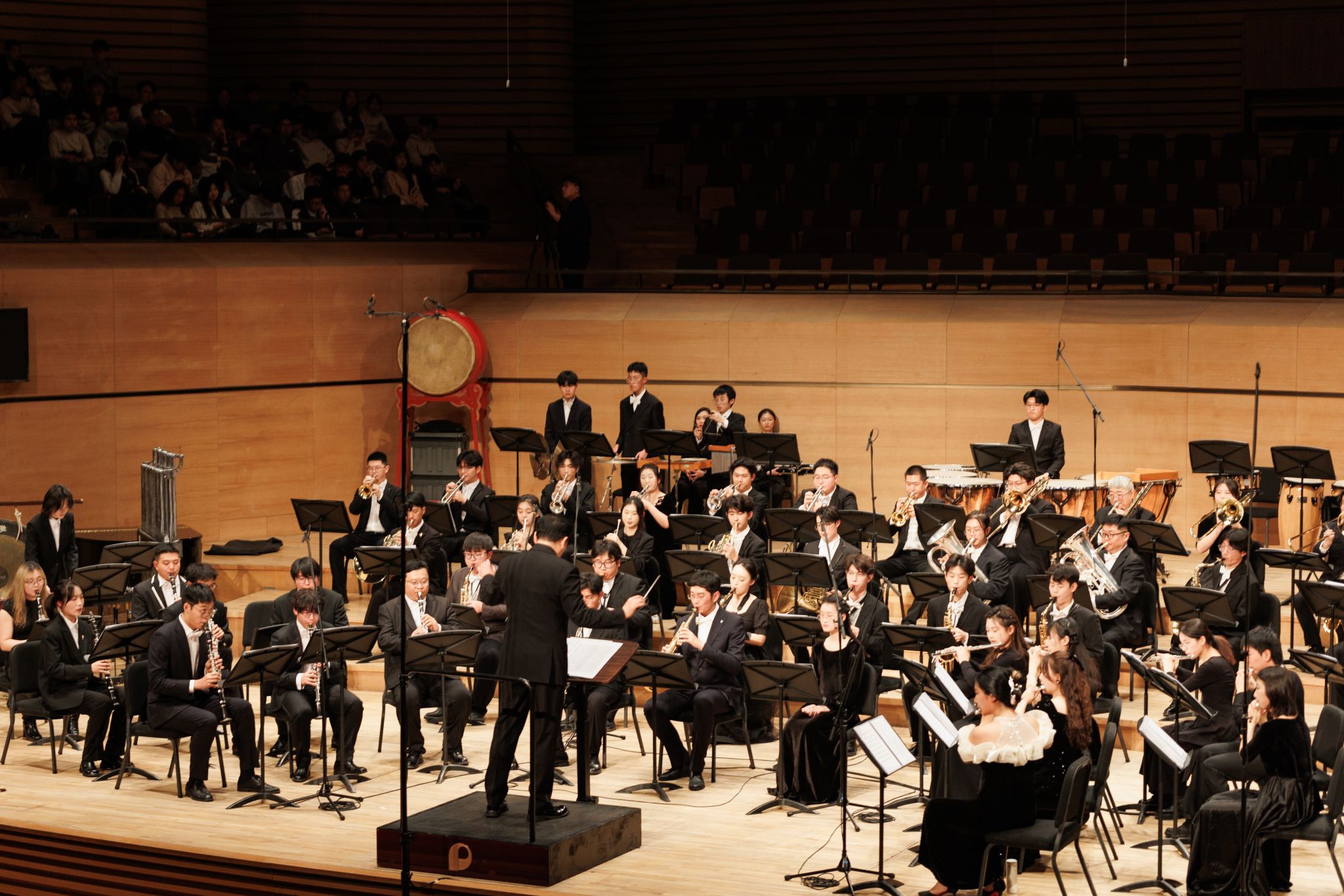 音乐会下半场,天津大学北洋民族管弦乐团在指挥贾爱婷带领下,为观众带来了浓郁的国乐风情:从喜庆热烈的《丰收锣鼓》到优美抒情的《良宵》,从特色鲜明的板胡协奏曲《乱弹琴声》到深情款款的《青青思念》,乐团用民族乐器深情讲述中国故事。压轴曲目《黄河畅想》更带给师生观众特殊惊喜:演出开始前,民乐团同学们就在大厅向观众赠送了寓意吉祥的拨浪鼓。演奏至此曲时,指挥现场教学如何用拨浪鼓模拟黄河浪涛之声。在上千名观众共同参与下,细密的鼓点由弱渐强,汇成一片“声浪”,与台上奔涌的琴瑟管弦水乳交融,仿佛千里黄河翻起波涛。这一别出心裁的互动设计,让观众不仅从聆听者变为参与者,更在共同演奏中深刻体验了黄河的磅礴生命力与中华民族自强不息的精神。应观众热情欢呼,乐团还加演了《赛马》与《花好月圆》,以欢快旋律寄托新年祝福,为音乐会画上圆满句号。