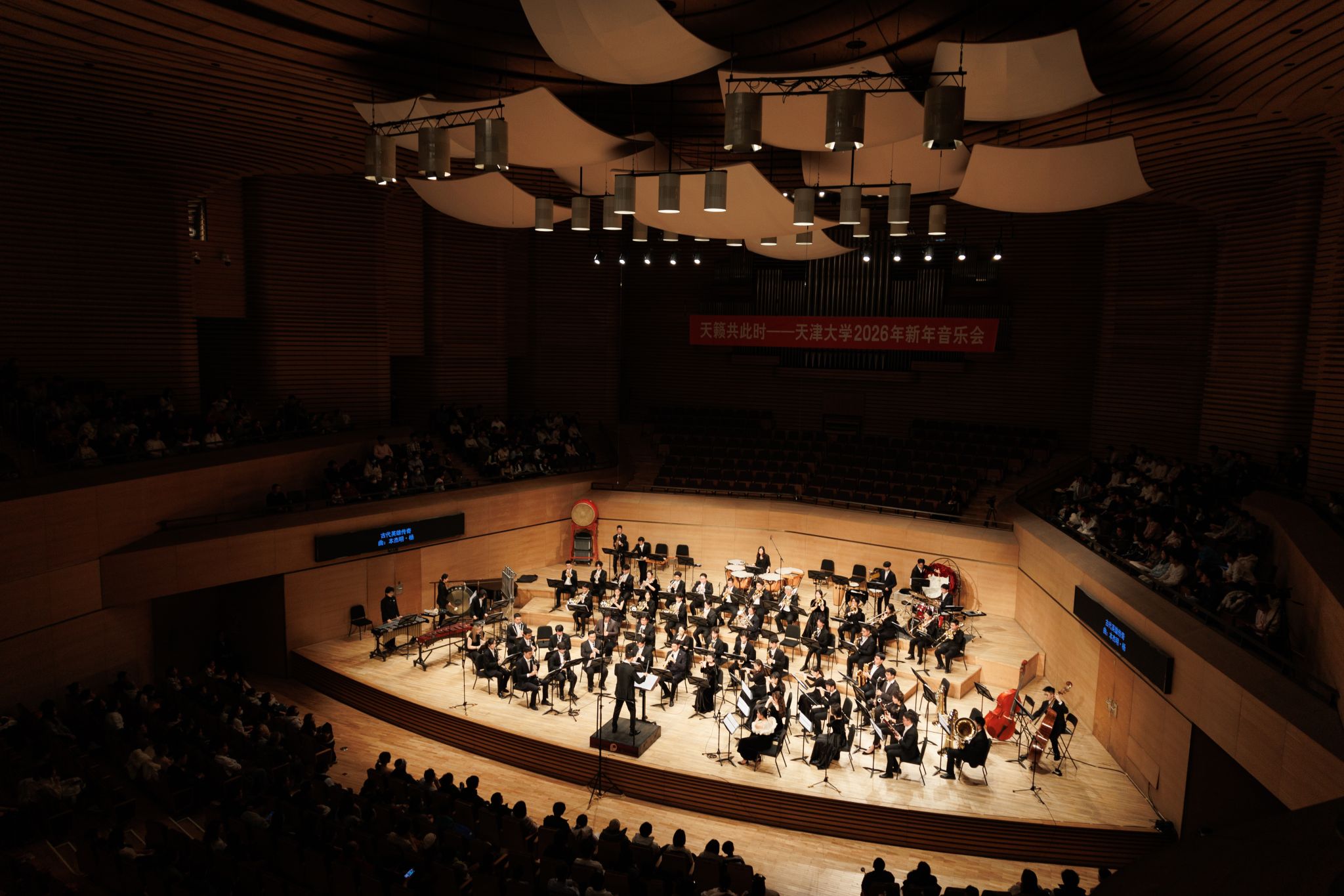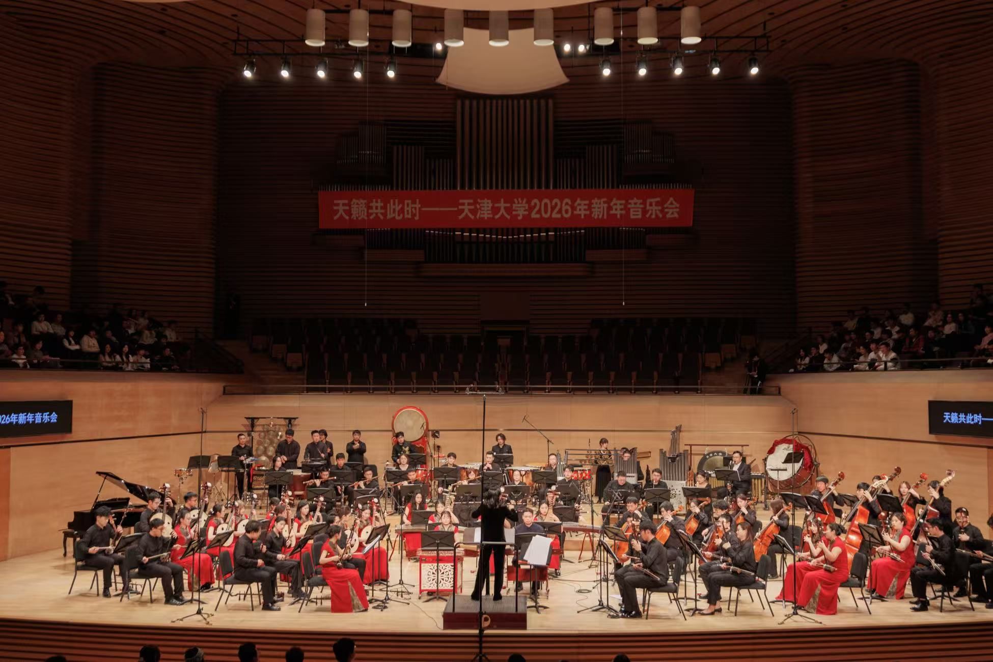 哪位国家级指挥“空降”舞台?耳熟能详的“大阅兵曲”会激起何等震撼的共鸣?上千名观众如何用一只拨浪鼓化身“演员”,奏响壮阔的黄河乐章?12月22日晚,“天籁共此时——天津大学2026年新年音乐会”在天津大剧院奏响。天津大学北洋军乐团与北洋民族管弦乐团联袂献艺,以中西合璧、气势恢宏的音乐盛宴,为师生校友和社会各界观众送上了一份充满家国深情的新年贺礼。