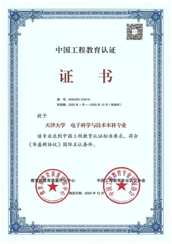 我校专业认证工作再获喜讯。天津大学电子科学与技术专业首次通过工程教育认证。