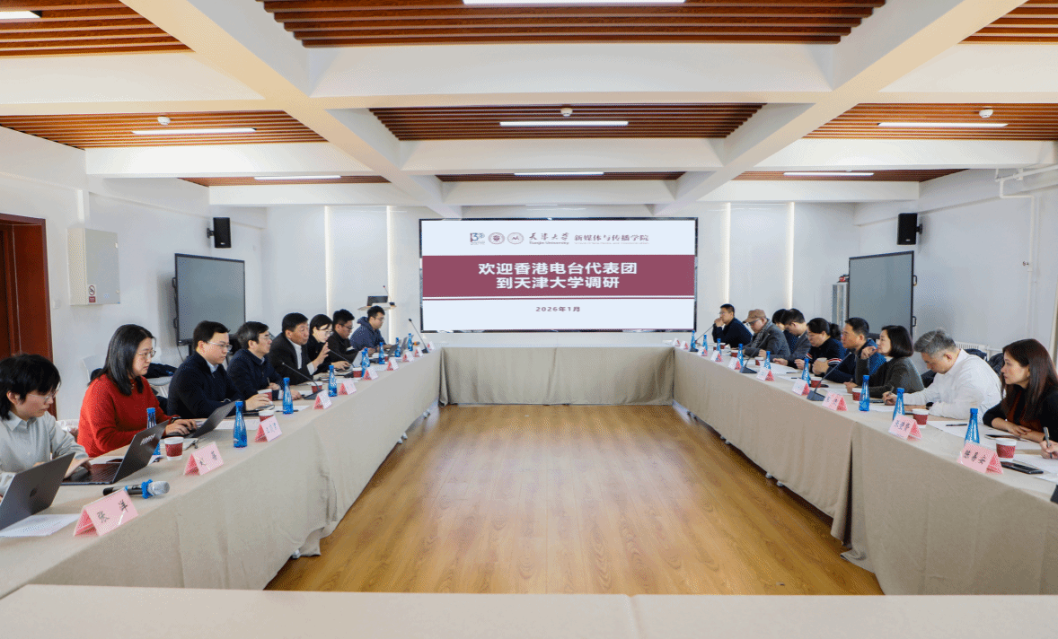 1月13日,香港媒体代表团一行访问天津大学,就深化津港媒体合作、人工智能技术应用及人才培养等议题进行调研交流。校党委常务副书记雷鸣会见代表团一行。国家广电总局中国广播电视香港记者站站长王喜凯,香港电台广播处处长关婉仪,天津市文化和旅游局(市广播电视局)党组成员、副局长于健,天津市委宣传部对外联络处处长邢美琪出席活动。校党委常委、宣传部部长杨欢,新媒体与传播学院院长陆小华,学院党委书记李嘉毅等陪同会见并参加相关活动。