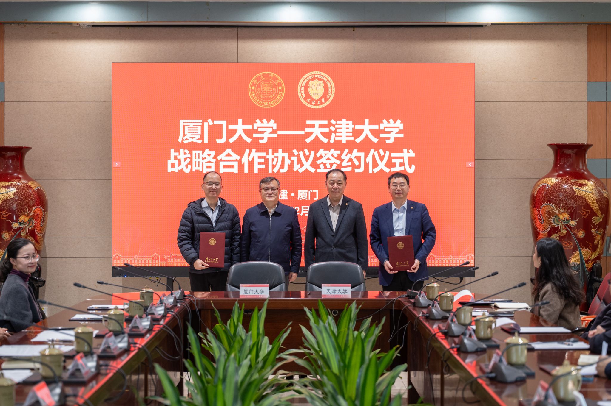 2月7日,厦门大学与天津大学签署战略合作协议。天津大学党委书记杨贤金,党委常委、副校长王天友,厦门大学党委书记、中国科学院院士张荣,校长、中国科学院院士胡文平,党委常委、副校长尤延铖出席签约仪式。