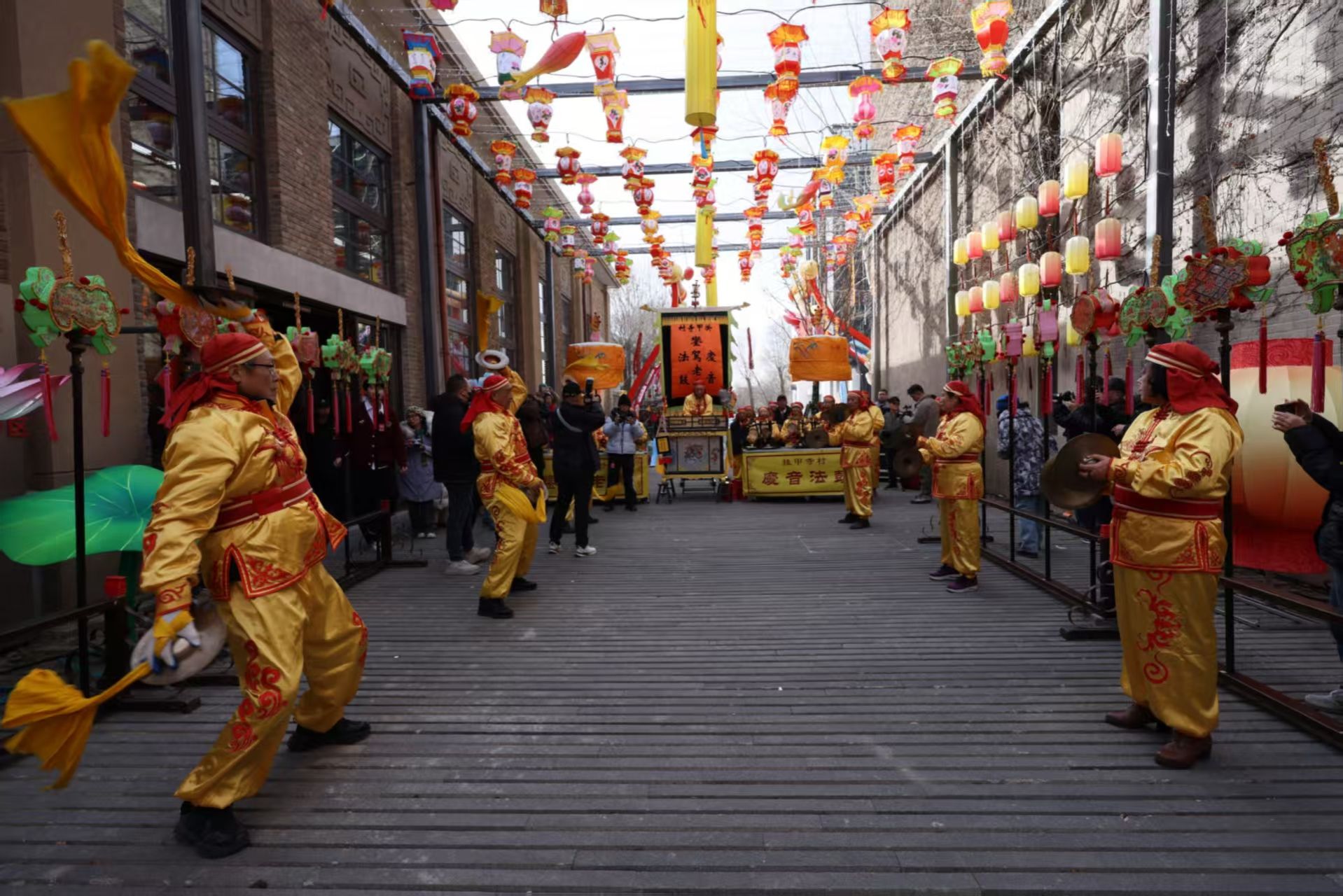 启动仪式后,当留校师生、留学生和孩子们走出博物馆北区的洞天门,眼前布满彩灯的青藤小路上,挂甲寺庆音法鼓会摆出半副銮驾,开始锣鼓喧天的表演,一下子就把大家带进过年热闹喜庆的氛围中。随后步入博物馆南区,博物馆工作人员和冯研院师生已经准备好各种丰富的活动。
