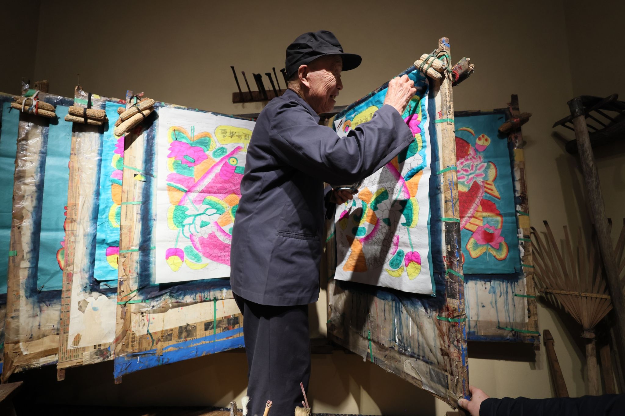 中国年画史馆的活动内容尤为丰富。观众跟随年文化主题讲解,探寻年的起源,了解年画背后的历史文化;在吉祥走廊用各式各样的吉祥符号心愿贴,制作一张属于自己的“马上有X”吉祥卡;在北方过年实景空间请灶王、品糖瓜,重温祭灶习俗;还能观看《大过新年》沉浸式视频,体味“以画过年”的津味年韵。年画史馆设有“细活”和“粗活”两个年画作坊,两位年画传承人在此带大家互动体验。王学勤站在炕头上,演示“粗活”技艺,讲解缸鱼年画寓意与贴法;霍庆有则带来一块福字印版,奔马、聚宝盆、弓箭图案寓意马到成功、财富丰盈,师生们纷纷拓印揭福。