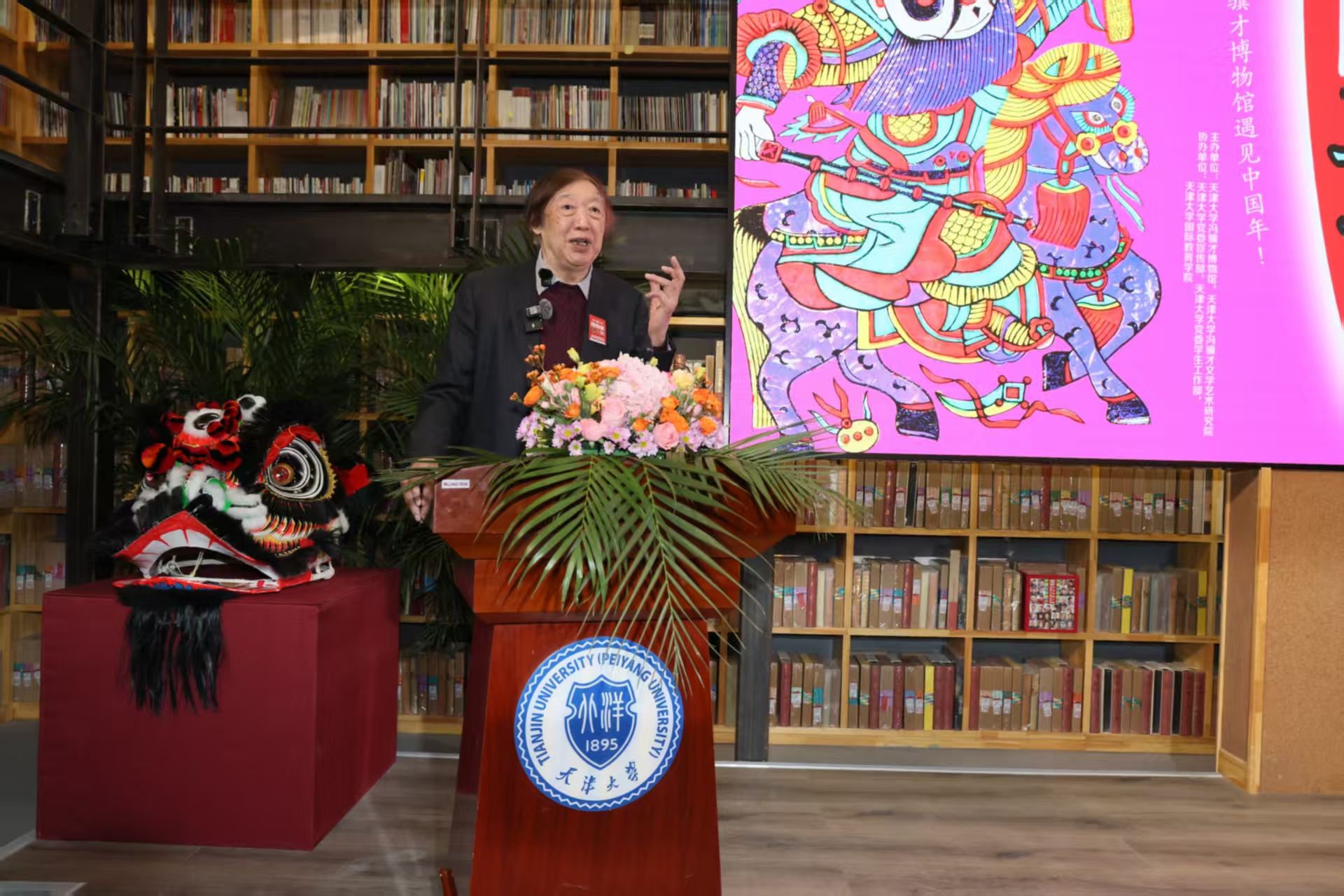 小年当天,天津大学党委书记杨贤金、校长柴立元、党委常务副书记雷鸣等校领导都来与师生们欢聚一堂。冯研院直属党支部书记张俊艳宣布活动正式启动。启动仪式台上,冯研院的非遗学硕士生与国教学院的埃及留学生搭档主持;台下,天津大学附属幼儿园的孩子们在嘉宾怀中一起观看百花龙狮团腾跃翻转、精彩迭出的表演。“杨柳青木版年画”国家级代表性传承人霍庆有、天津市级传承人王学勤,“挂甲寺庆音法鼓”国家级代表性传承人傅宝安,“海下同善文武高跷”天津市级传承人张永环也来到现场,从冯骥才先生和校领导手中接过年礼。