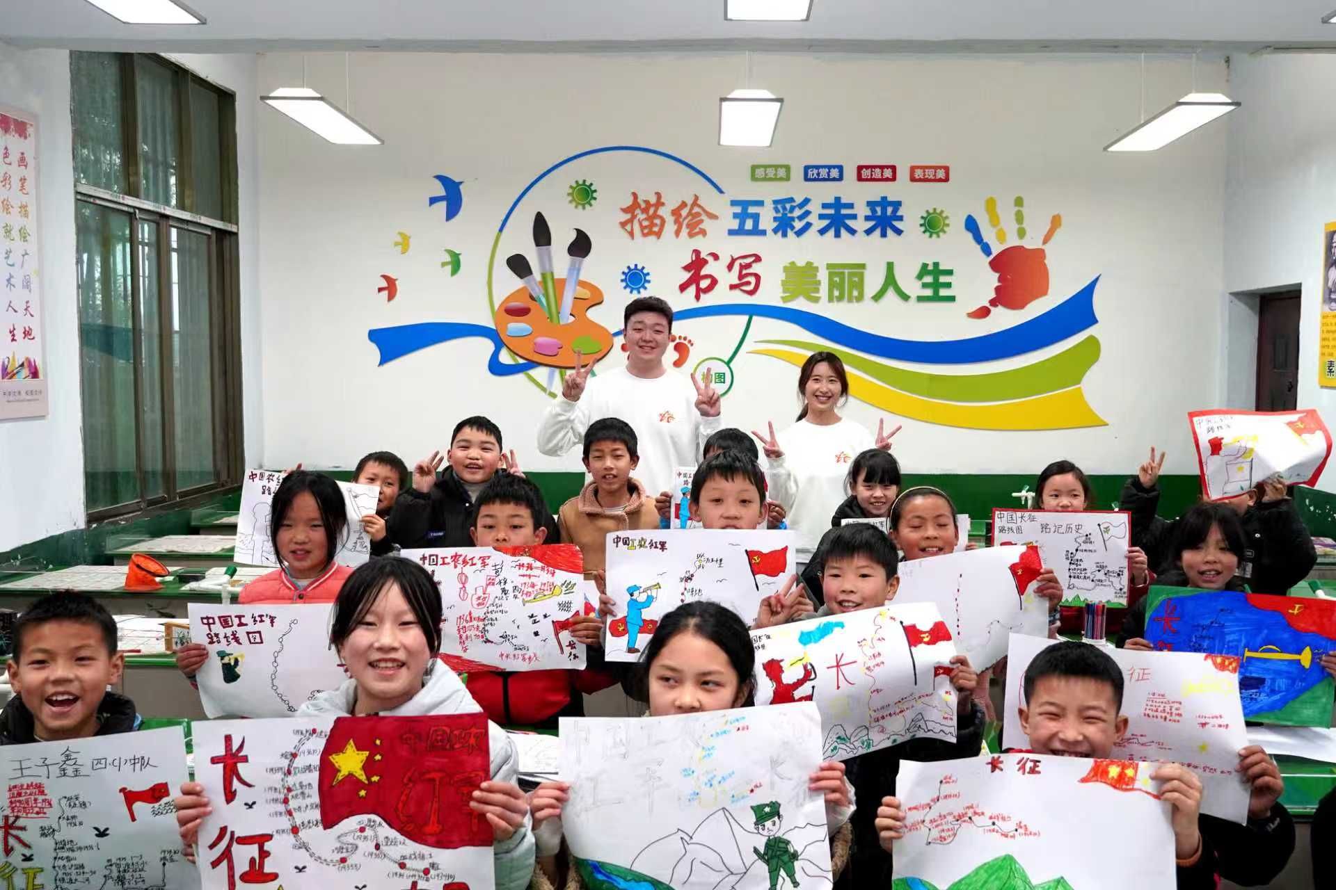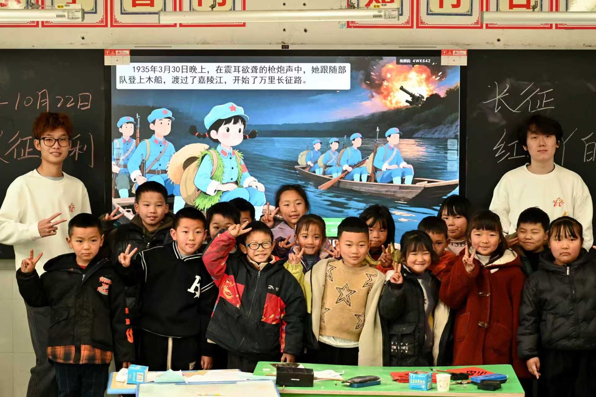 这是天津大学“星火”支教队今冬社会实践的一幕。针对不同学段学生的认知特点,队员们量身打造差异化教学内容,让长征精神可感知、可参与、可表达。低年级课堂上,孩子们围坐共读绘本《长征路上红小丫》,实践队队员、环境科学与工程学院2024级本科生漆彦希轻声问道:“红小丫和你们差不多大,她走完了长征,你们能成为自己的小英雄吗?”话音刚落,一双双小手举了起来。中年级的《长征路线创意手绘》课上,支教队员将长征历史地理与珙县本土红色足迹融合,三年级学生代静雯用彩笔勾勒出蜿蜒的路线图,惊喜地说:“原来红军战士曾经来过我的家乡!”