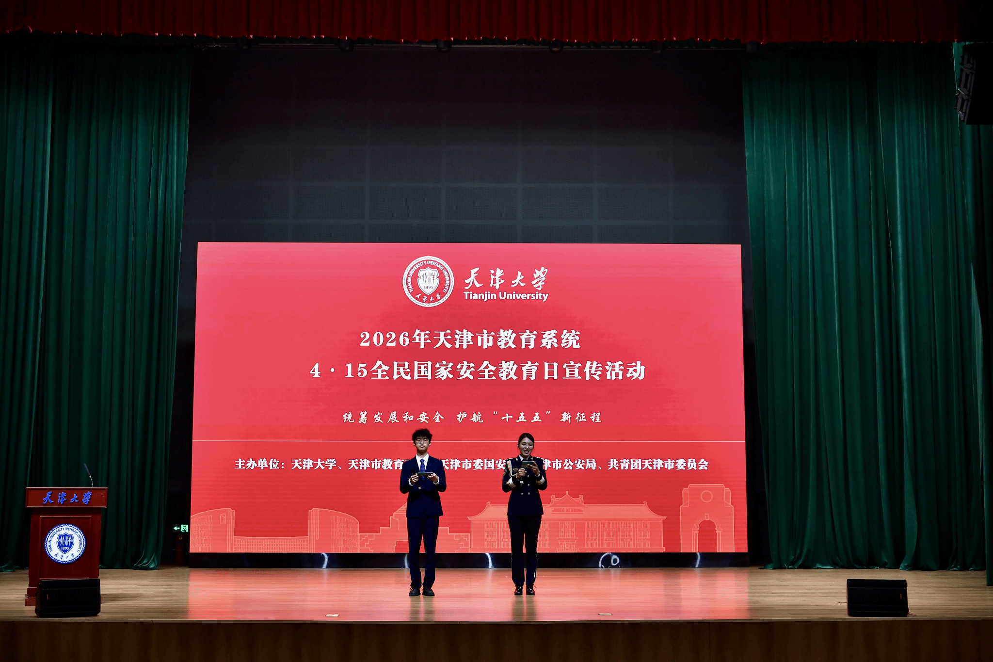 为进一步提高广大师生维护国家安全的意识,共筑校园安全防线,4月15日,天津大学联合天津市公安局、天津市教育两委、天津市委国家安全委员会办公室、共青团天津市委员会在北洋园校区共同举办“天津市教育系统2026年全民国家安全教育日集中宣传活动”。本次活动以“统筹发展和安全,护航‘十五五’新征程”为主题,市、校各级主办单位相关负责人,全市各高校安全工作分管领导、公安干警代表及师生代表共580余人出席启动仪式。