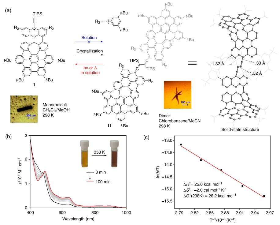 作者进一步发现,通过改变结晶溶剂体系,可获得σ-二聚体晶体。在溶液中,该σ-二聚体可在热或光刺激下发生可逆的碳-碳键断裂,裂解恢复为自由基单体,热解离活化能ΔG = 26.2 kcal mol-1,展现出可切换的自旋态特性。