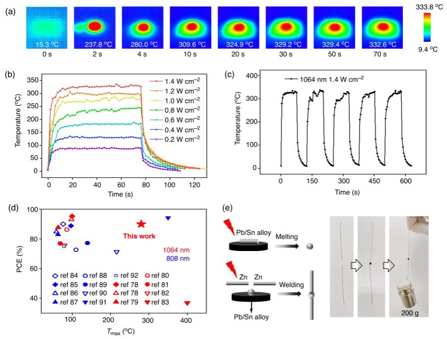 该自由基经单电子氧化得到的阳离子1+SbF6-在1238 nm处呈现NIR-II吸收带(ε = 1.36 × 104 M-1 cm-1),理论计算表明该跃迁具有显著的电荷转移特性(48.9%)。在1064 nm激光(1.4 W cm-2)照射下,其粉末温度能迅速升温至332.6°C,光热转换效率高达90%,经过五次连续开/关循环后性能无明显衰减。这一综合性能在已报道的1064 nm激光激发的有机NIR-II光热材料中处于领先地位。利用这一光热效应,作者将该材料应用于激光焊接,涂覆有1+SbF6-粉末的Sn/Pb合金(熔点183°C)在低功率密度激光照射下熔化,成功将两根直径0.4 mm的锌丝焊接在一起,焊接后的锌丝可提起200 g重物(约自身重量的1000倍)。