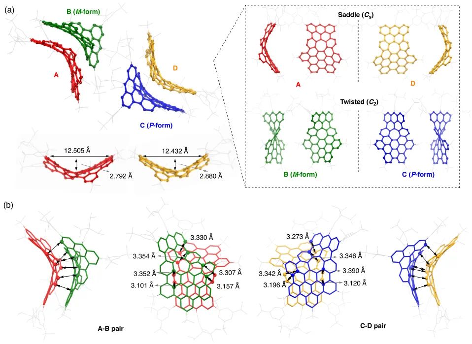 作者对化合物1的结构和性质进行了表征。单晶X射线衍射表明,化合物1的不对称单元中包含四个晶体学上独立的分子(A、B、C、D)。其中,A和D采用Cs对称性的鞍形构象,B和C构成一对C2对称性的手性扭曲构象的对映体(B为M构型,C为P构型)。四种构象共存于同一晶格中,此类现象在[7]圈烯及其类似物中尚未见报道。Cs和C2构象通过自旋配对和凹凸π-表面的形状互补性,分别组装成A-B和C-D两对π-二聚体。变温NMR研究表明,Cs和C2构象在溶液中存在动态互变,异构化能垒为14.4 kcal mol-1。RMSD分析表明,鞍形构象A和D与理论预测的磁性碳施瓦茨体结构高度吻合,可作为构筑该类材料的理想分子砌块。