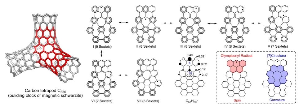 碳施瓦茨体是一类理论预测的三维碳纳米结构,其骨架因嵌入七元环或八元环而呈现出独特的负高斯曲率。理论预测表明,这类结构中由七元环位点局域化的三价碳自由基可产生本征磁性,为碳基自旋电子学提供了新可能。然而,原子级精确的碳施瓦茨体至今未能合成。具有负曲率的稠环芳烃不仅可以做为研究施瓦茨体的模型分子,还可以做为通过“自下而上”策略合成施瓦茨体的砌块。尽管关于闭壳负曲率纳米石墨烯的研究已取得重要进展,但由于自由基单元的高反应活性及负曲率带来的环张力,开壳负曲率纳米石墨烯的合成与分离尚未实现。