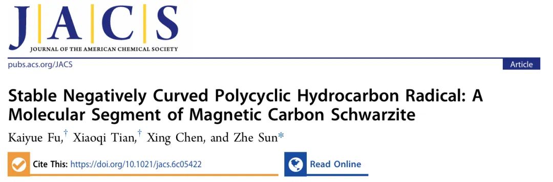 天津大学孙哲课题组长期致力于稳定有机共轭自由基的设计、合成与功能研究。基于该团队前期在平面共轭自由基体系的研究(J. Am. Chem. Soc., 2020, 142, 11022;J. Am. Chem. Soc. 2022, 144, 2095;Angew. Chem. Int. Ed. 2023, 62, e202301046;Angew. Chem. Int. Ed. 2023, 62, e202313257;Nat. Synth., 2023, 2, 1104; Angew. Chem. Int. Ed. 2023, 62, e202306078;J. Am. Chem. Soc., 2025, 147, 18122; Angew. Chem., Int. Ed., 2025, 64, e202520605),近日,该团队报道了首个稳定的负曲率共轭碳自由基的合成。该分子融合了奥林匹克烯自由基(OR)和[7]螺烯结构单元,将未成对电子和负曲率集于一个骨架之中。该分子作为磁性碳“施瓦茨”结构(Schwarzite)的精确分子片段,不仅为理解这类预言中具有本征磁性的三维碳材料的磁学性质提供了理想的模型,其氧化衍生物还展现出卓越的近红外二区(NIR-II)光热性能,在激光焊接等领域展现出巨大应用潜力。
