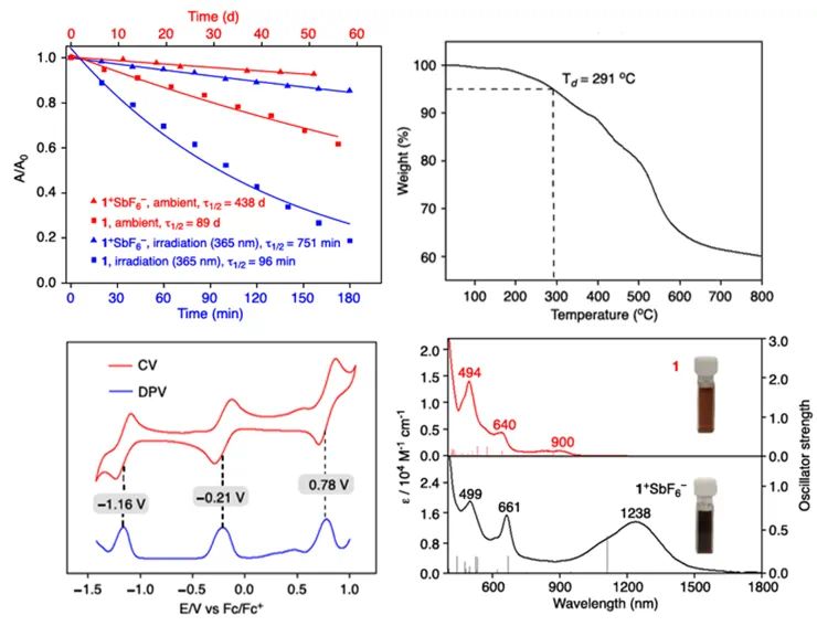 自由基1具有优异的稳定性,在空气氛围下溶液态半衰期长达89天,固态热分解温度达291℃,阳离子1+SbF6-的稳定性更为突出,半衰期长达438天。这表明扩展π-骨架上的有效自旋离域以及外围取代基提供的动力学保护有助于增强自由基的稳定性,对于阳离子物种,环庚三烯阳离子亚结构中6π芳香性的恢复提供了额外的热力学稳定化。电化学研究表明,自由基1的电化学带隙(0.95 V)显著窄于奥林匹克烯自由基(1.24 V),并观测到少见的自由基二价正离物种,表明嵌入的七元环能有效稳定正电荷,进一步凸显了负曲率独特的电子效应。