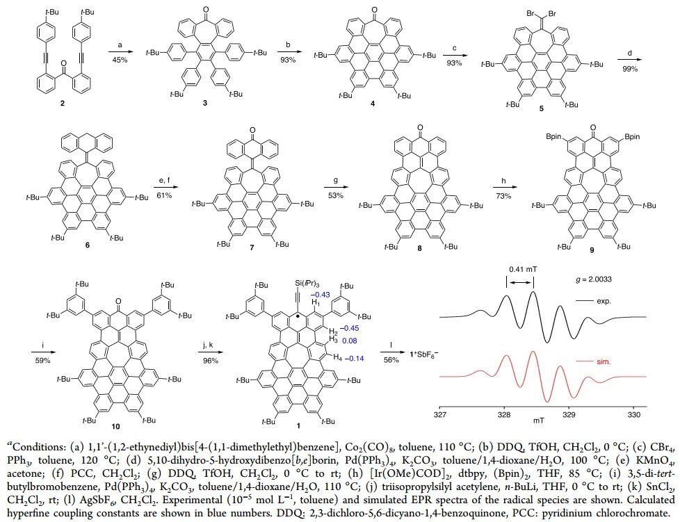 作者以已知化合物2为起始原料,经过炔的环三聚、Ramirez反应、Suzuki偶联、氧化、Scholl反应、C-H硼化以及亲核加成/还原等一系列转化,最终得到目标自由基1。自由基1的结构经X射线单晶衍射、高分辨质谱及EPR超精细耦合裂分确认。通过AgSbF6的单电子氧化,进一步获得了稳定的阳离子物种1⁺SbF6-。