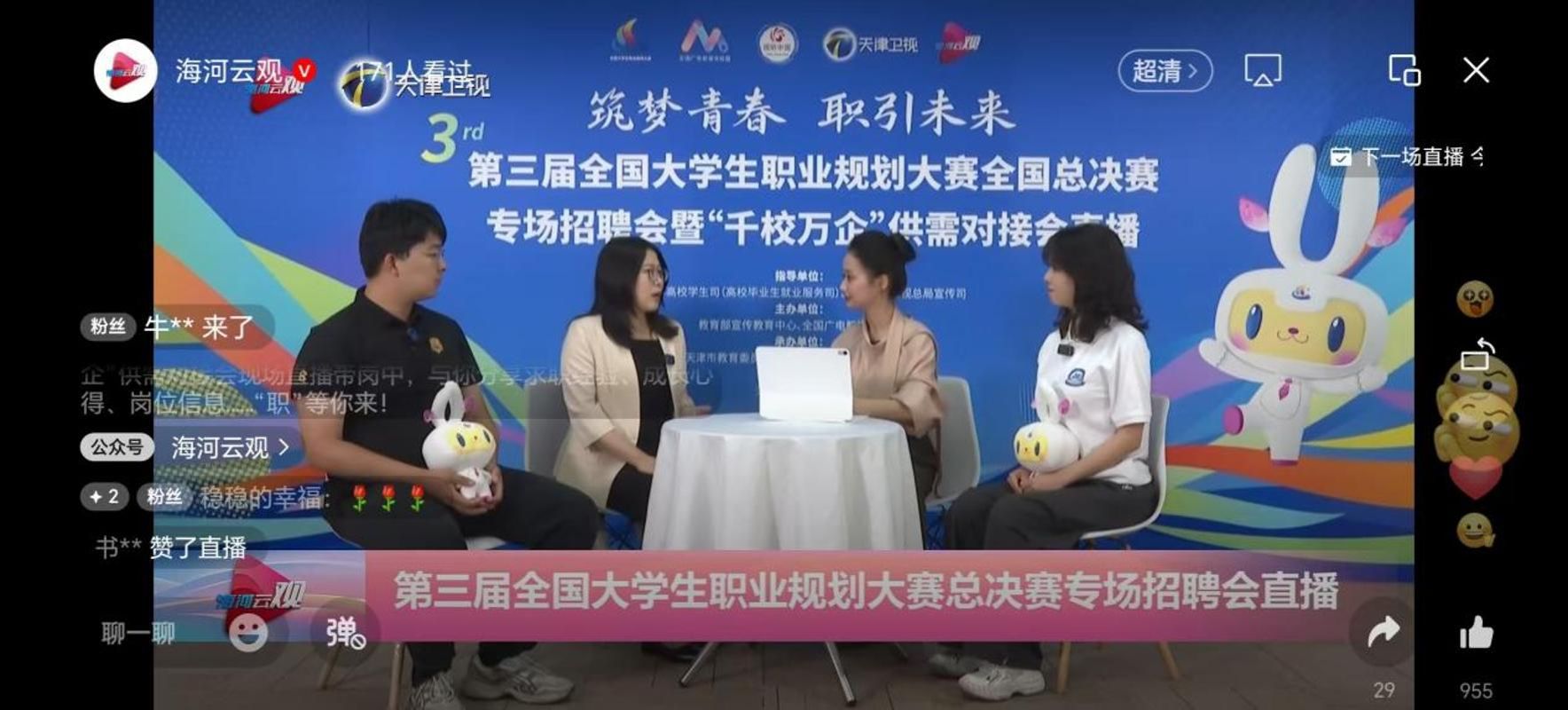 “我们今年计划招聘200名应届生,欢迎敢于创新、不怕吃苦的同学加入!”“比赛教会我用企业视角重新规划职业路径,这是我求职成功的关键。”……现场同步举办了“送岗位、传经验、强指导”主题直播路演活动。直播间里,企业代表轮番上阵开展“直播带岗”,详细讲解岗位需求与发展前景;优秀毕业生代表分享求职经历与朋辈经验;职业生涯规划专家则围绕就业政策、面试技巧等话题进行微辅导,实时回答弹幕提问。