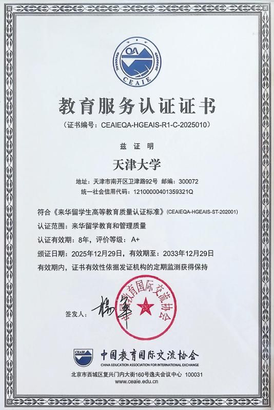 此次荣获来华留学生高等教育质量认证最高A+等级,是对天津大学来华留学工作成效的高度肯定。学校将以此为契机,持续深化“留学天大”品牌建设,落实《天津大学来华留学教育2030行动计划》,为服务国家外交大局、推动构建人类命运共同体贡献天大力量。