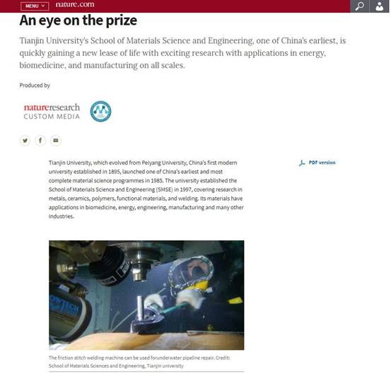 本站讯(通讯员 孙慧超)2019年3月20日,Nature在其官方网站发表了题目为“An eye on the prize”的文章对天津大学材料学院进行了报道。