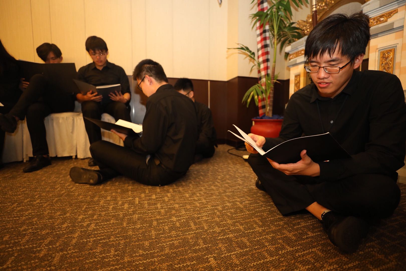 合唱团团员们在休息室看曲谱
