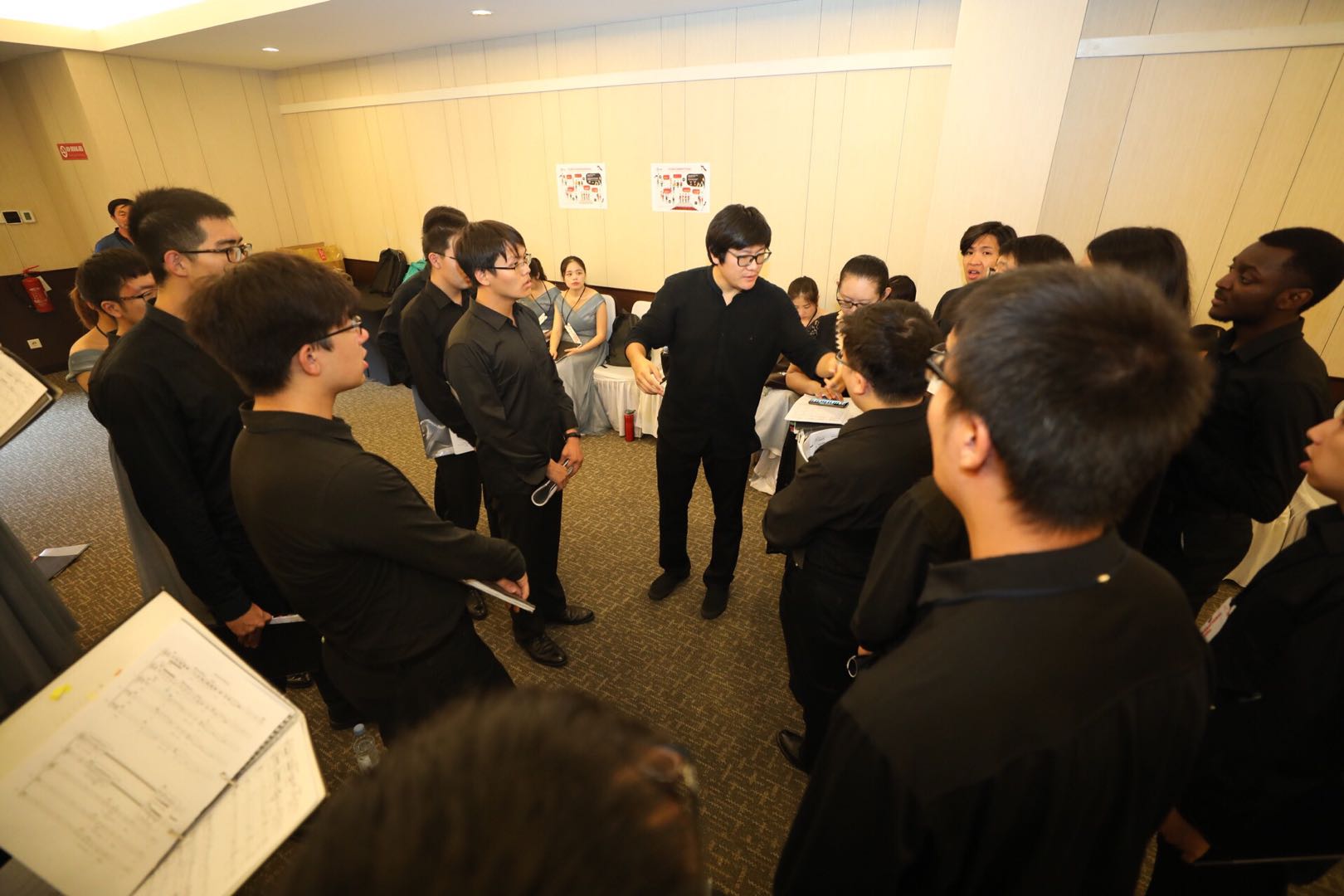 由于赛事安排紧张,合唱团只能在比赛间隙和休息时间进行高强度的排练,分析演唱中存在的问题并进行调整。温雨川和毛湧两位指挥老师采用新鲜有趣的声乐训练方法,帮助大家把握作品细节,臻求完美。