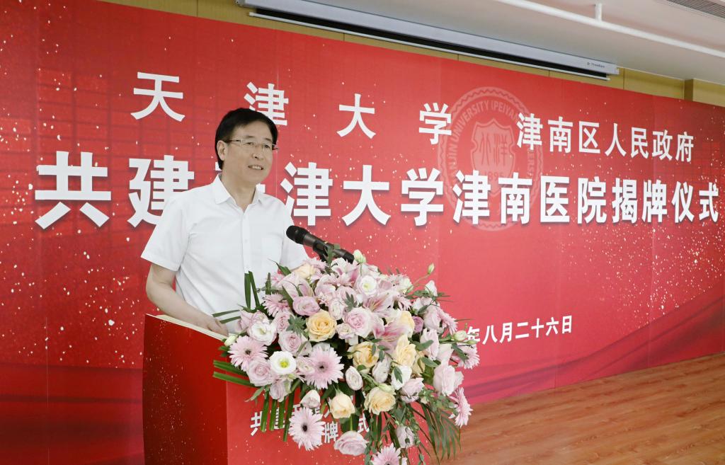 本站讯(通讯员 姚旺 摄影 唐蒙)8月26日上午,天津大学、天津市津南区人民政府共建天津大学津南医院揭牌仪式举行。天津大学党委书记李家俊,中国工程院院士、校长金东寒,津南区委书记刘惠,区委副书记、区长邓光华共同为天津大学津南医院揭牌。