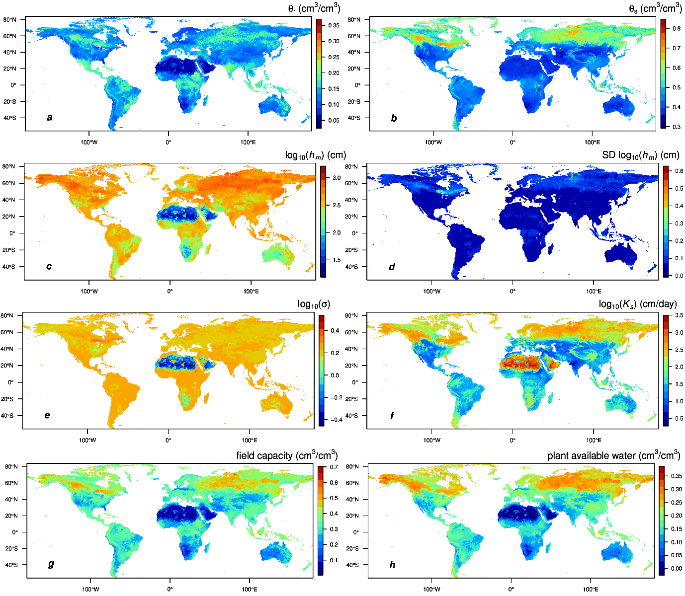 图:全球表层土壤1km网格土壤水力参数 (a)残余含水量,(b)饱和含水量,(c)压力水头中位值(取log10),(d)压力水头中位值(取log10)的方差,(e) 压力水头的方差(取log10),(f)饱和渗透系数,(g)田间持水量,(h)植物可利用水分。