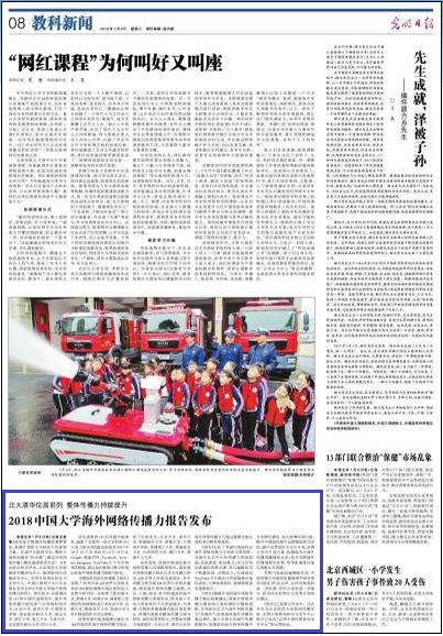 本报北京1月8日电(记者王斯敏)高校是开展国际传播的重要载体,是提升国家文化软实力的重要力量。在海外互联网平台,哪些中国高校最有“存在感”,通过自身网络传播力建设赢得更多关注?为对此给出科学评估,北京师范大学新媒体传播研究中心、教育新闻与传媒研究中心,光明日报智库研究与发布中心,中国日报网于8日在京联合发布《2018中国大学海外网络传播力报告》。报告显示,在被测评的141所中国内地高校中,海外网络传播力排名前十位的高校依次为:北京大学、清华大学、中国美术学院、南京航空航天大学、南京大学、浙江大学、复旦大学、天津大学、北京航空航天大学、四川大学。